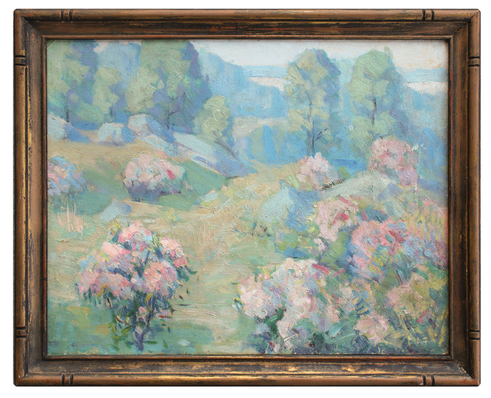 BATES, Kenneth, (American, 1895-1973): ''Laurel Time'', Lush Landscape Abloom, Oil/Board, 11'' x 14'', incised signature lower right, titled verso, painted frame, 13'' x 15.75''.