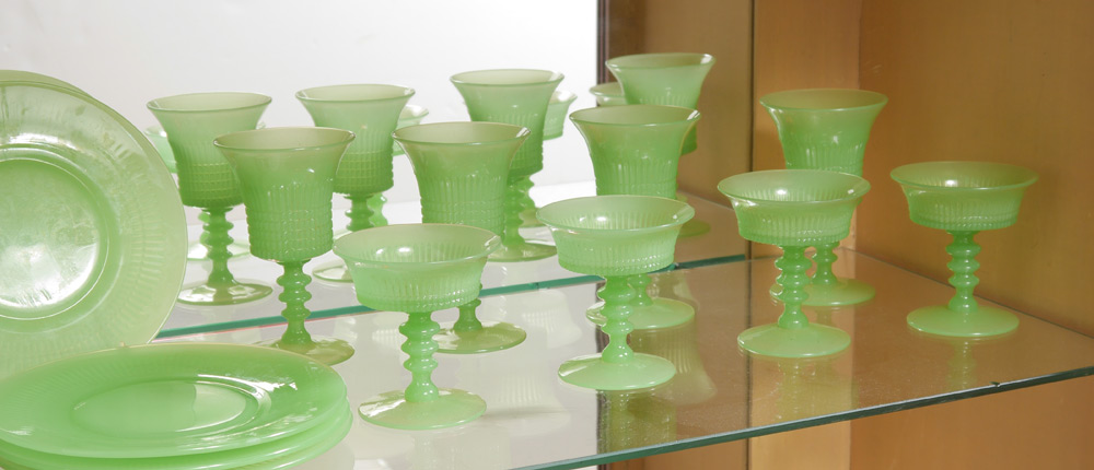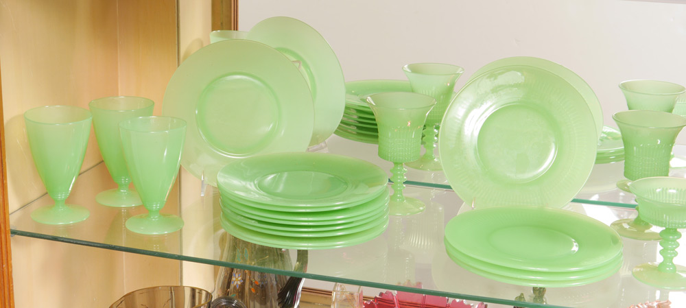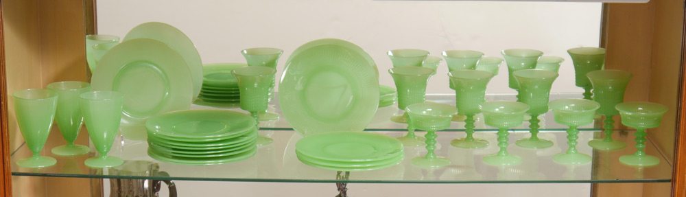 FENTON LINCOLN INN JADE GLASSWARE PLUS: To include 5 goblets (5.75''), 4 sherbet champagnes (4''), and 4 salad plates (8''). Sold together with 9 jadeite plates (8'') and 3 jadeite ice tea glasses. 25 pieces total.