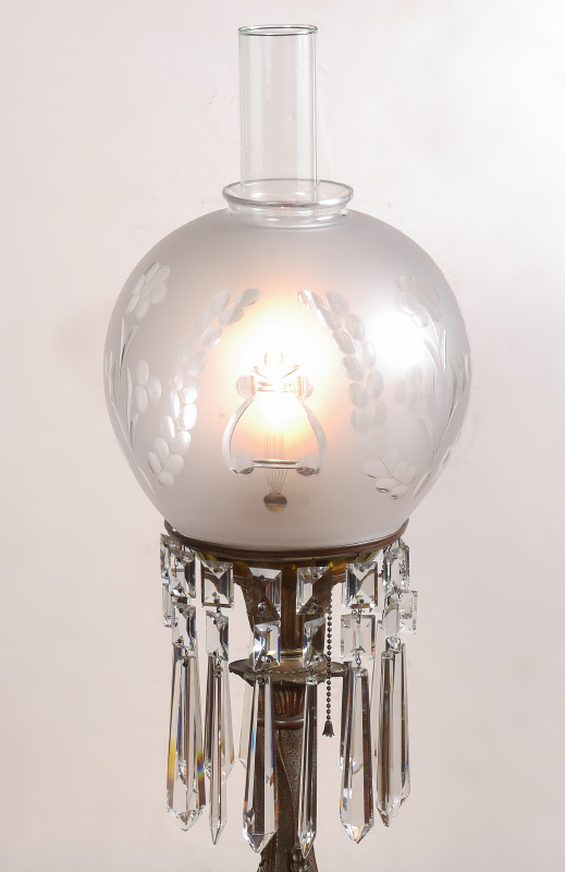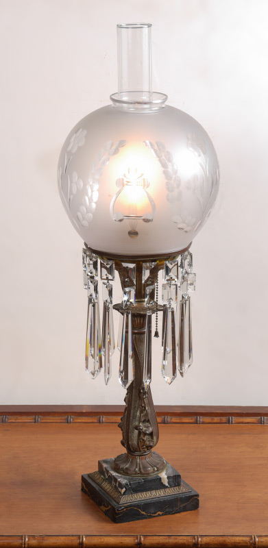 GONE WITH THE WIND LAMP WITH PRISMS: Patinated case metal body on stepped marble base, large crystal drop prisms, single light electric socket. 17 3/4'' h. x 6 1/2''. Etched and frosted globe shade, 9'' h. x 8 3/4'', 12'' chimney.