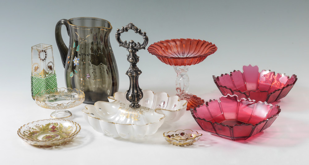 COLLECTION OF BOHEMIAN GLASS INCLUDES MOSER: Approx. 10 pieces to include 1) A 9'' hand enameled pitcher. 2-3) Pair cranberry thick glass bowls, 3'' high x 8''. 4) Small etched compote, 2'' tall x 5'' dia. 5) A 6'' green cut glass vase with gilt enhancements. 6) A cranberry glass compote with tree trunk stem 6 1/2'' x 8''. 7) A large white cut to clear divided dish with silverplate handle. 8-10) 3 small etched reverse gilt and enameled fruit and flower dishes.