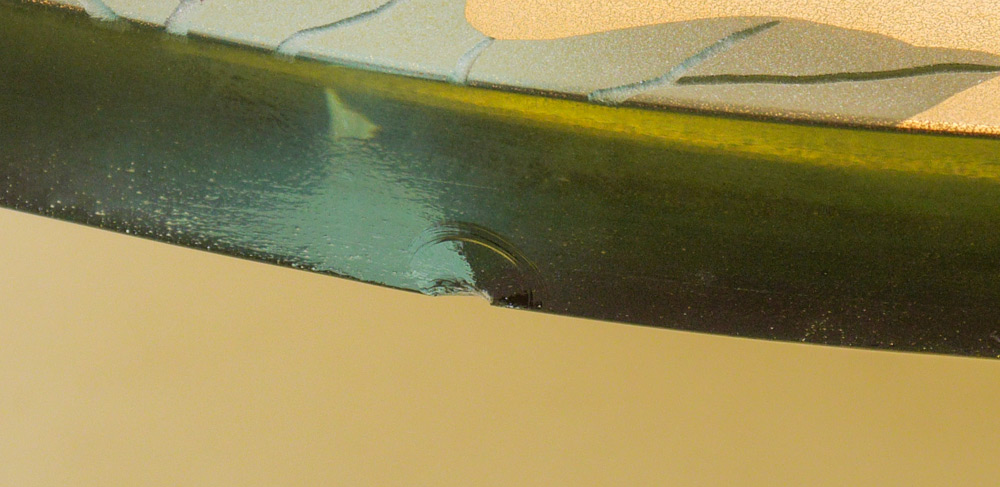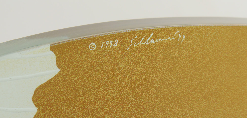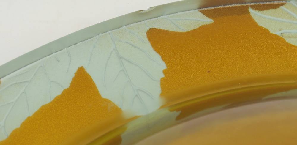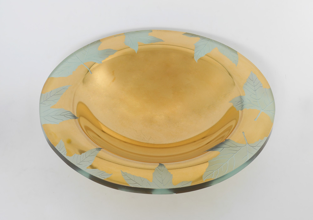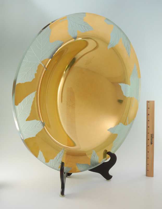 LARGE LEAF MOTIF ART GLASS BOWL: Gold decorated glass bowl with engraved frosted green leaves around rim. Illegibly signed and dated 1998, measures 4 3/4'' h. x 21 3/4'' dia.