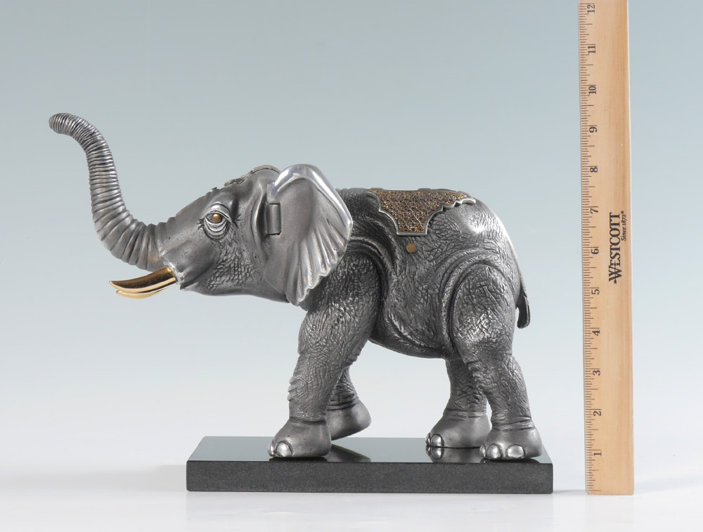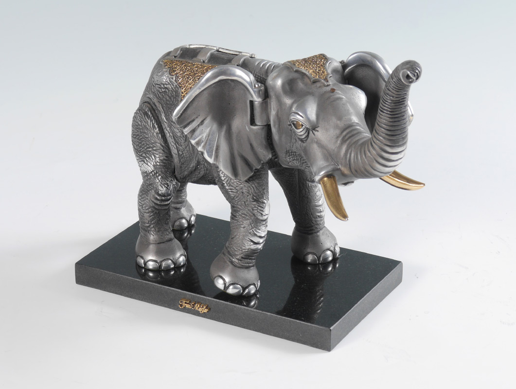 MEISLER, Frank, (Israel, 1929-): Elephant, Cast and Polished Articulated Steel Sculpture with Plated Accents, 8.5'' with marble plinth, 13'' w., 5'' d., signed and numbered 150/980.