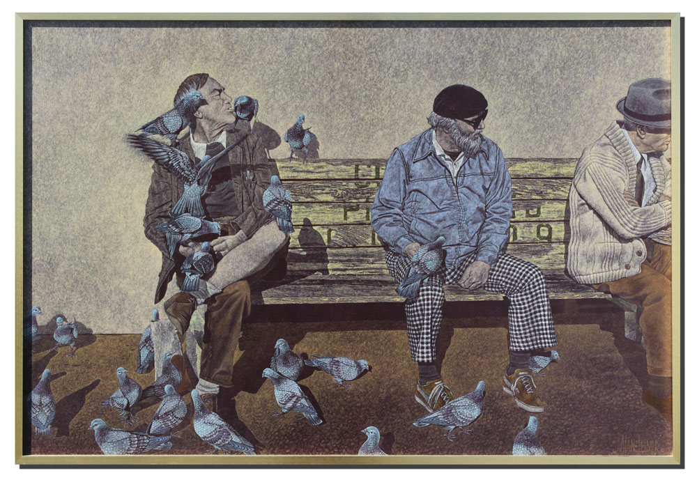 LEINER, Al, (American, 20th century): ''From Hand to Mouth'', ACRYLIC/Masonite, 32'' x 48'', signed lower right, signed and titled verso, encased in thin edge metal frame, 32'' x 48''.