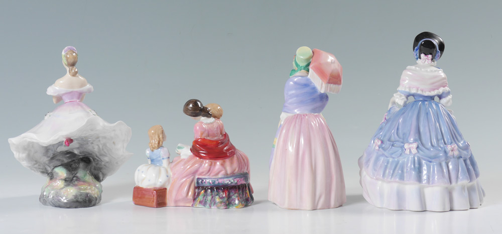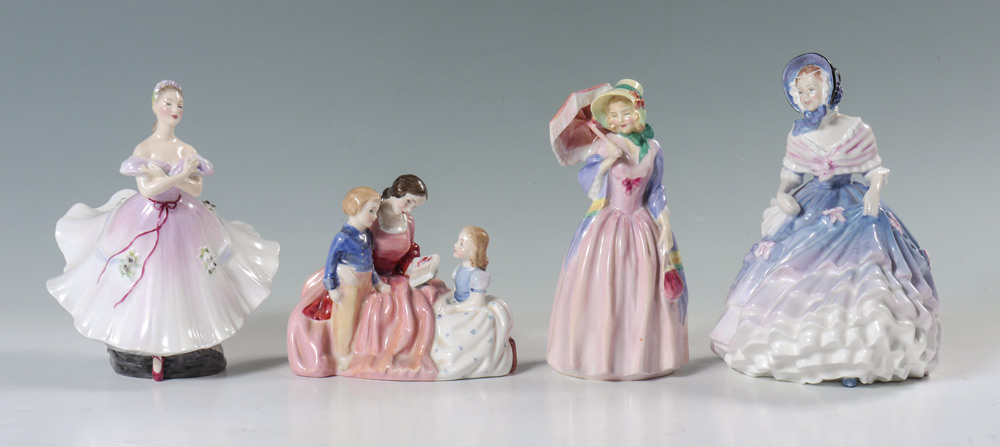4 ROYAL DOULTON FIGURINES: ''Miss Demure'' HN1402, ''Alice'' HN3366 8 1/4'' h. x 6'', ''The Bedtime Story'' HN2059, ''The Ballerina'' HN2116.