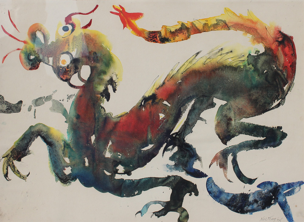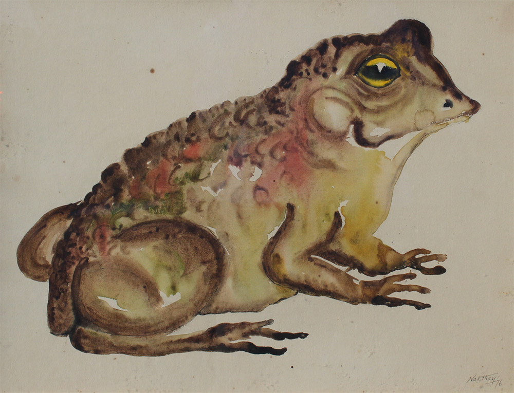 NORTHEY, John, (American, 1914-1995): 1) Study of a Toad, Watercolor, sight size 17'' x 24, signed lower right and dated '76, framed, 24'' x 30''. 2) Oriental Dragon, Watercolor, sight size 18.5'' x 25.25'', signed lower right and dated '75, framed, 24'' x 30.25''. 3) Modernist Urban Park Scene, sight size 9.25'' x 12.25'', signed lower right and dated '61, framed, 17'' x 20.25''.