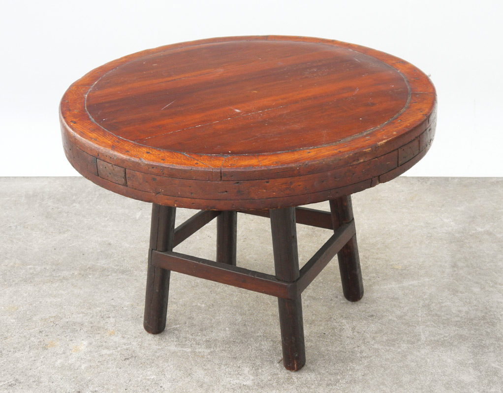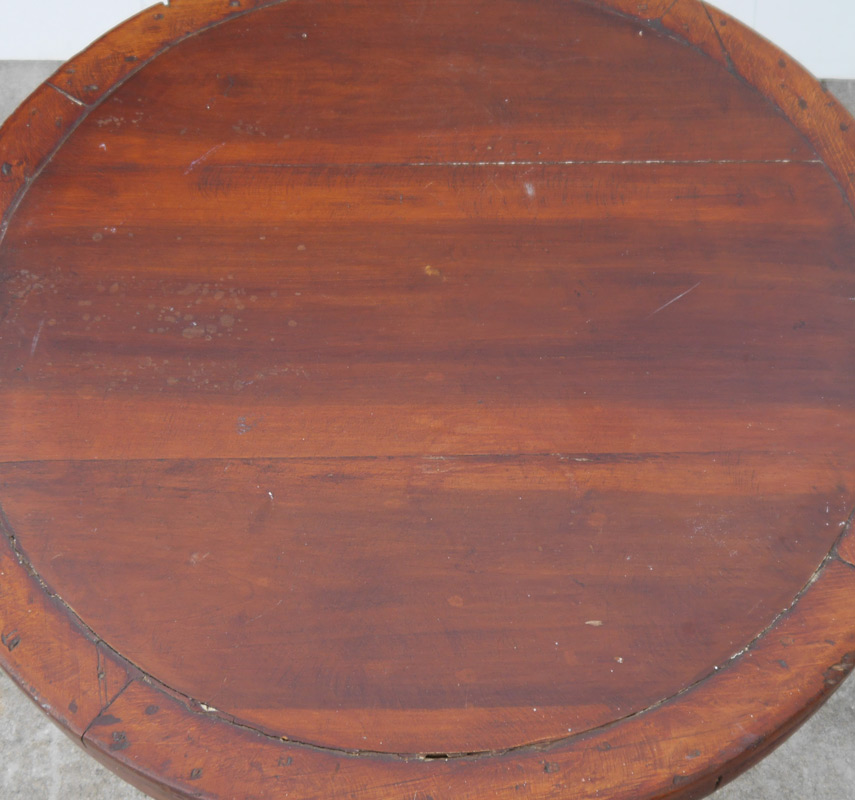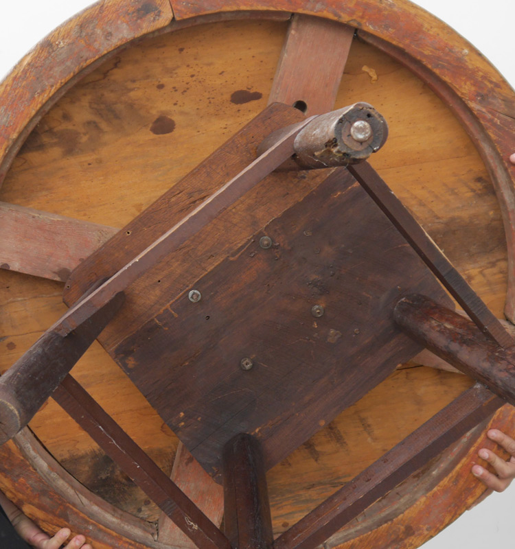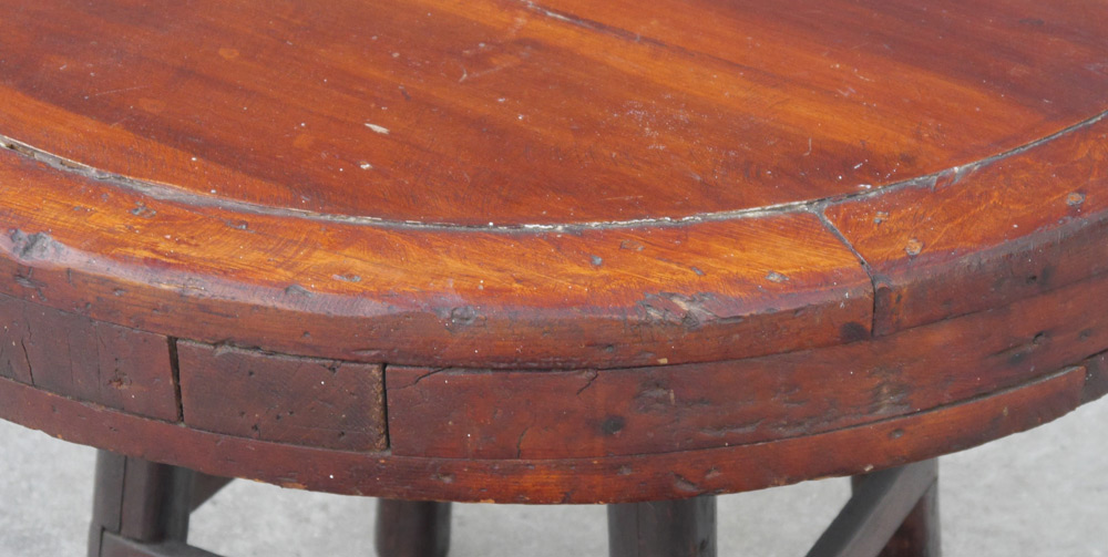 LARGE EARLY ROUND SWIVEL TOP TABLE: Circular lazy susan top with pegged trim, base with 4 legs and stretchers, most likely a tradesman's table. Overall measures 29 1/4'' h. x 40 1/4''.