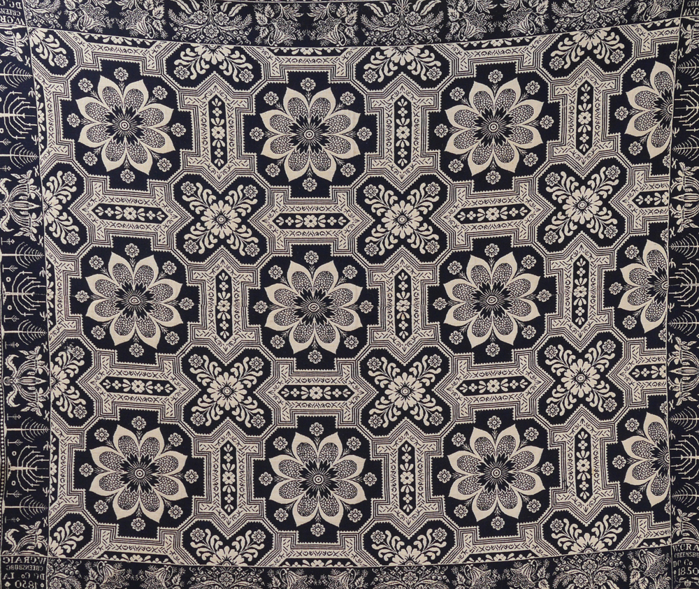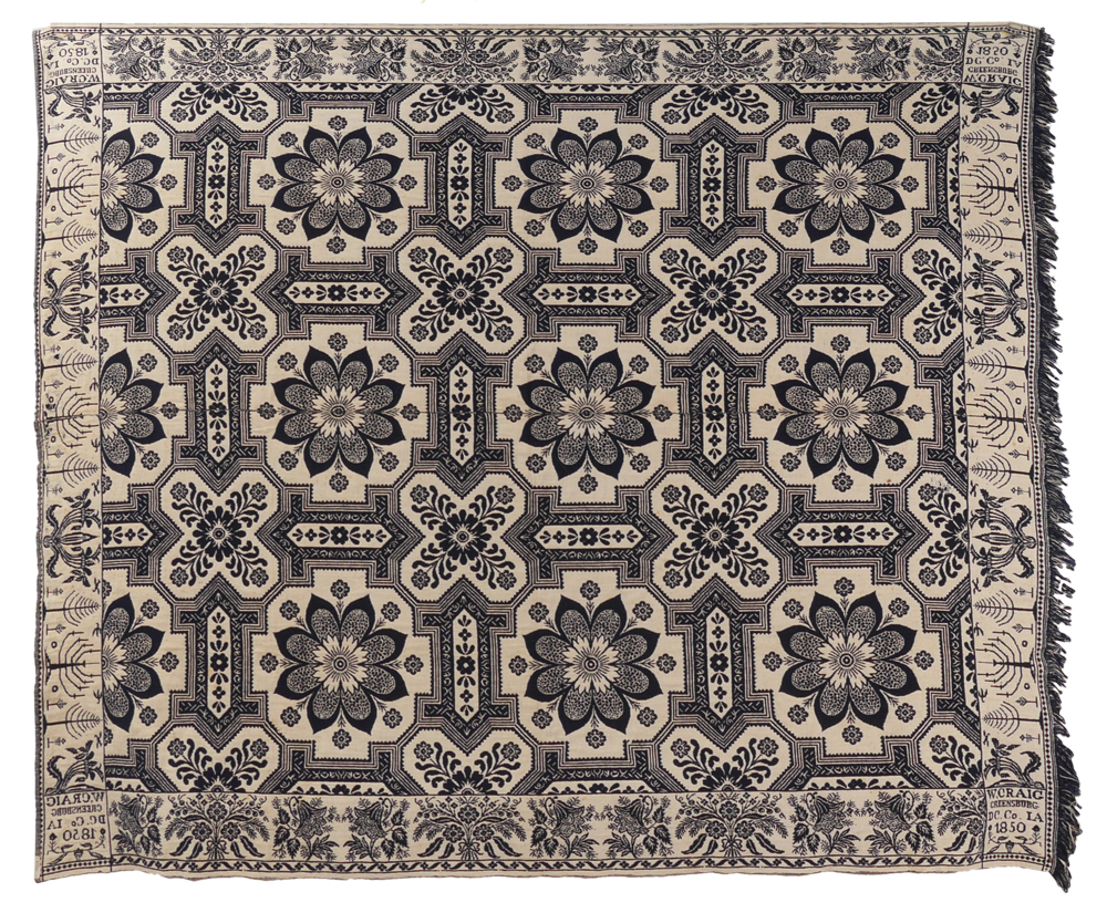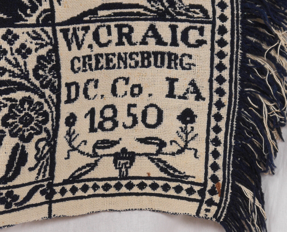ANTIQUE INDIANA JACQUARD COVERLET DATED 1850: WC Craig Greensburg DC.Co. IA 1850 woven into each of the corners. One end with fringe. Measures approx. 7'2'' x 6'2''.