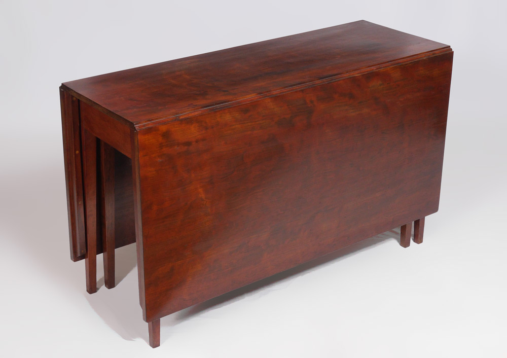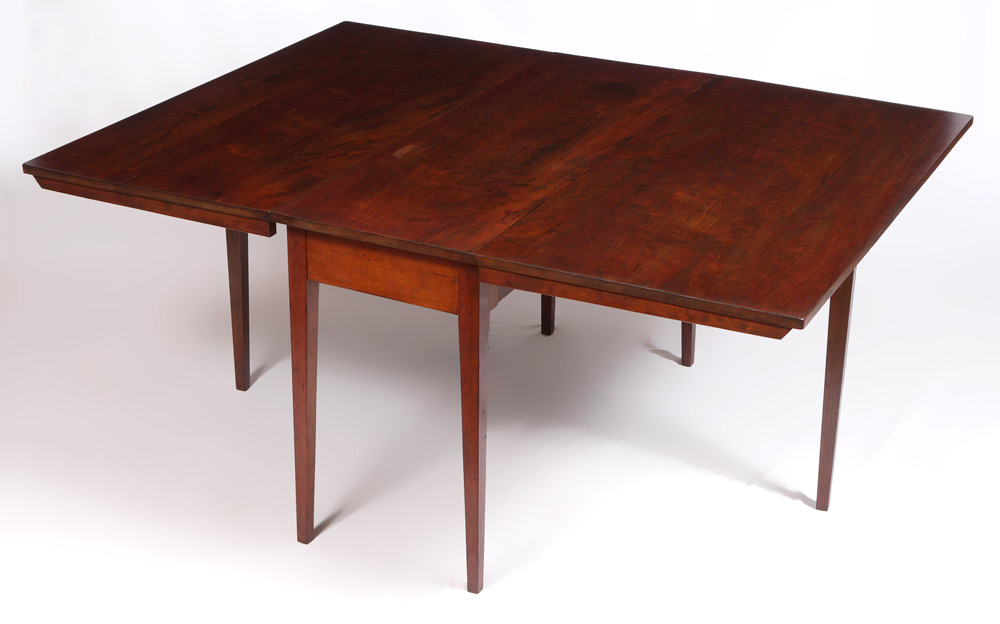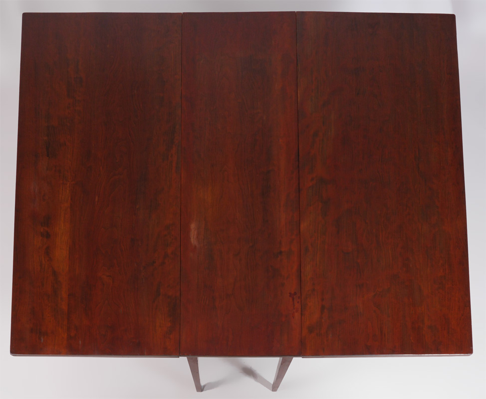EARLY SINGLE BOARD DROP LEAF TABLE: Single board top, tapered legs, each drop leaf comprised of extra wide boards. Closed measures 28 1/2'' h. x 17 1/2'', each leaf 23'' wide.