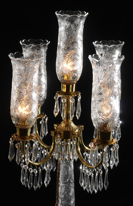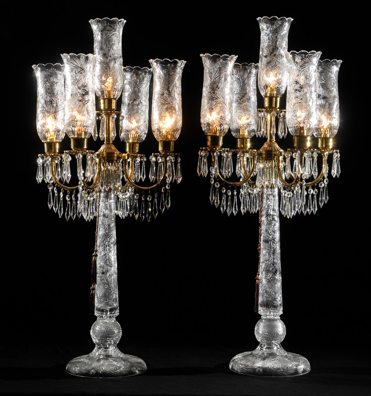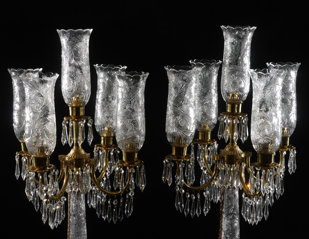 PAIR CUT GLASS TABLE TORCHIERS: Bohemian cut glass base 5 light table torchiers, 4 shaped brass arms with crystal prism drops, center light, hurricane style cut glass shades. Overall measure 42'' h. x 18'' dia.