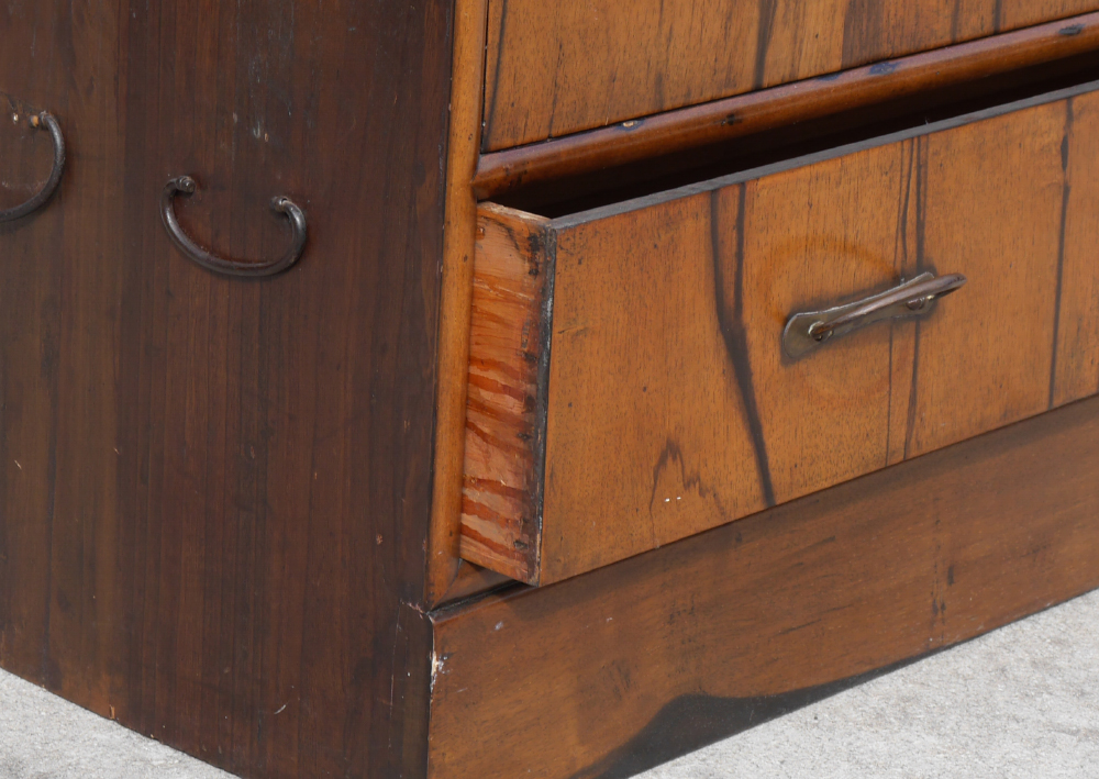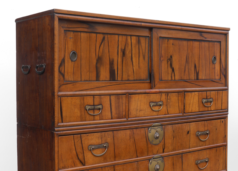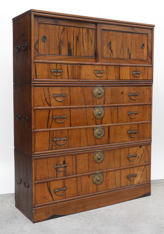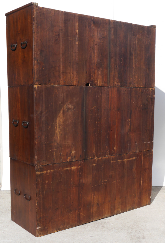 3 PART STACKING ORIENTAL CAMPAIGN CHEST: Early 20th century, in 3 stacking sections. Top with 2 sliding doors over drawer, center with 3 drawers, base with 2 drawers and base. Overall 62 1/2'' h. x 47 1/4'' x 16 1/2''.
