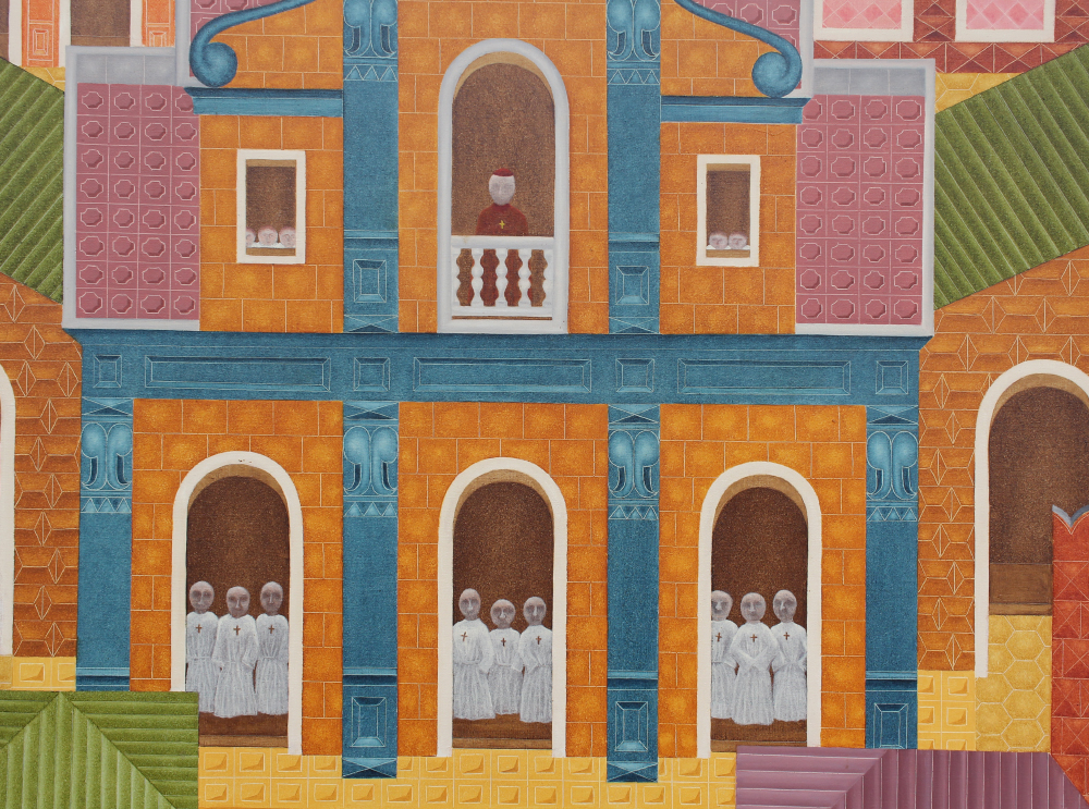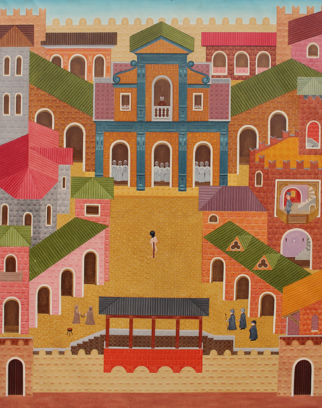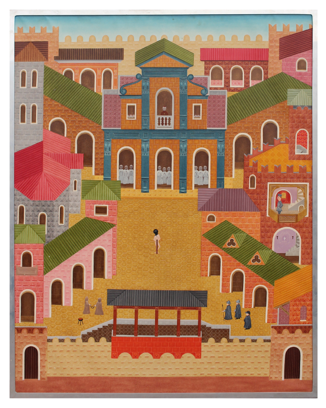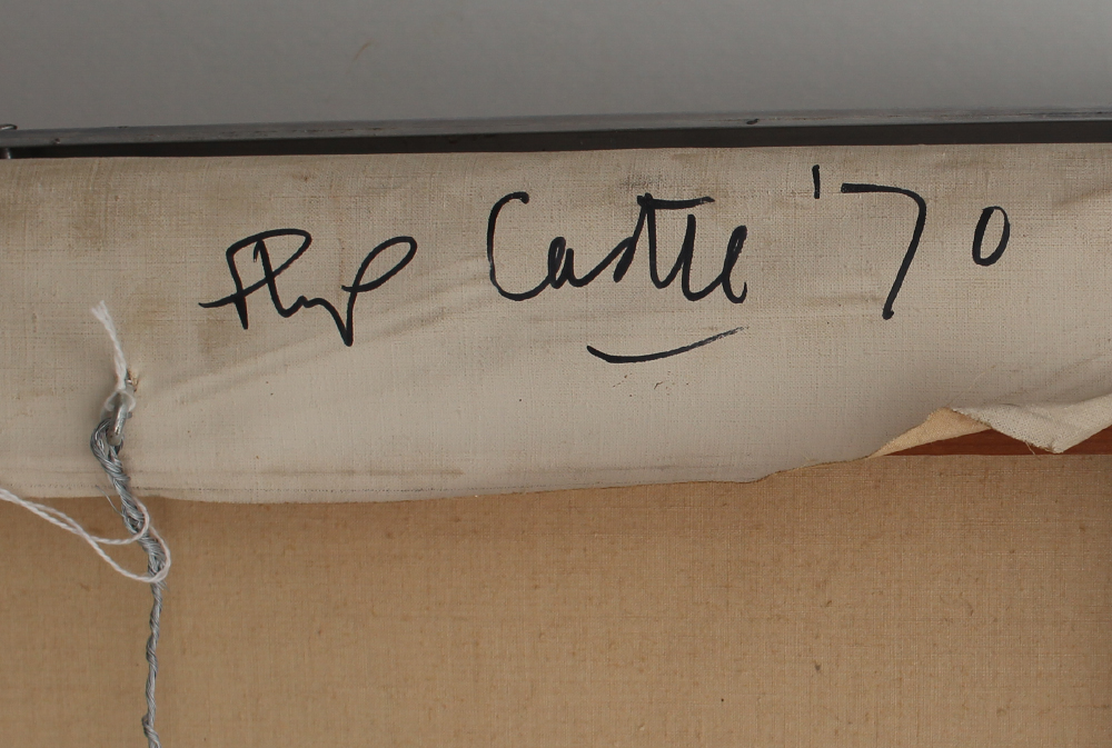 CASTLE, Phillip, (English, born 1942): Scene of Religious Punishment, Oil/Canvas, 50'' x 40'', signed twice on canvas verso, 1970, monogrammed on canvas verso, thin edged metal frame, 50.5'' x 40.5''.