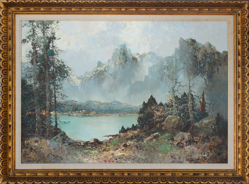 BAUER, Willi Vert, (German, born 1923): Alpine Lakeside Scene, Oil/Canvas, 27'' x 39'', signed lower left, carved gilt frame, 34'' x 46''.