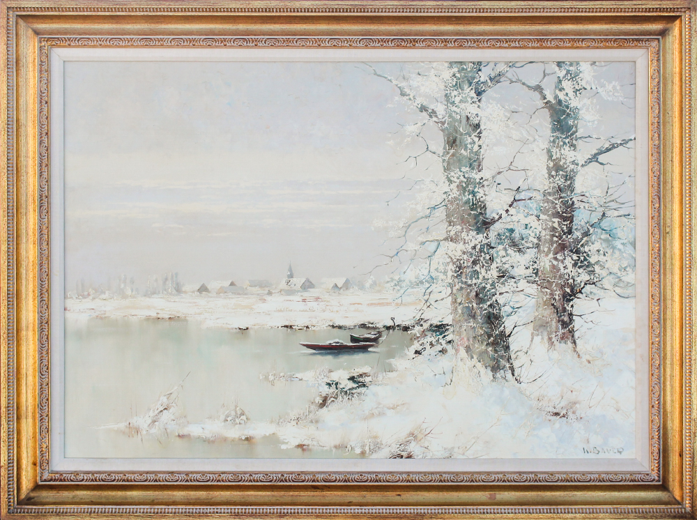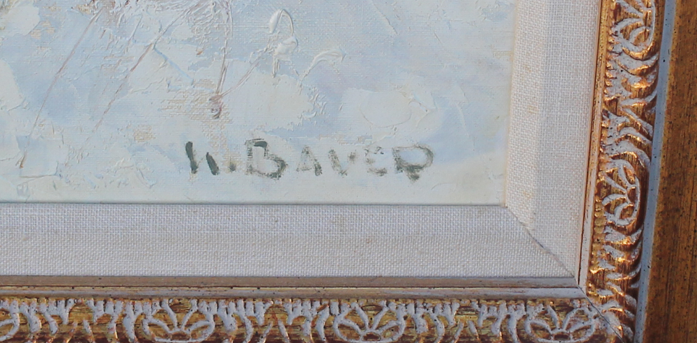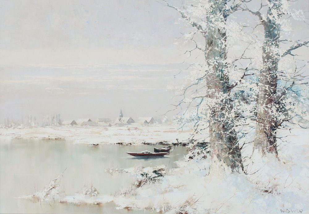 BAUER, Willi Vert, (German, born 1923): Snowy Lakeside Scene, Oil/Canvas, 27'' x 39'', signed lower right, framed, 34'' x 46.5''.