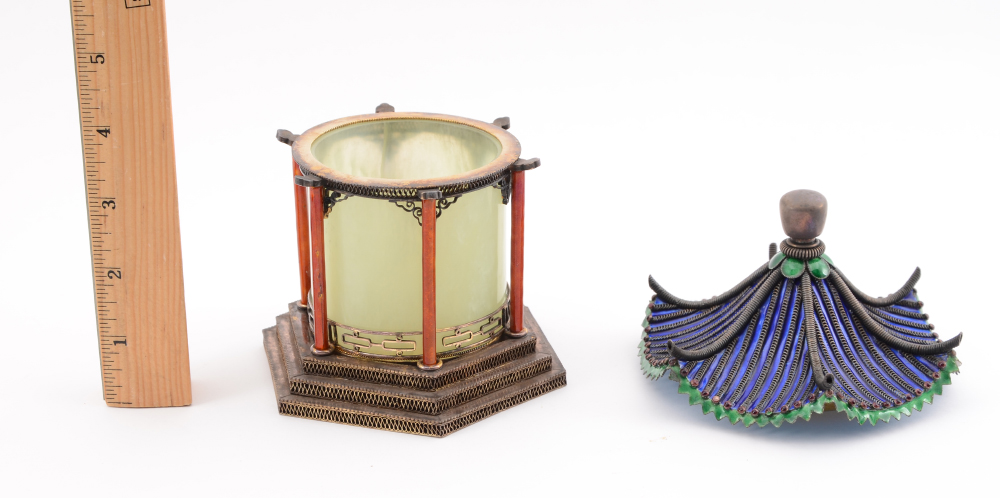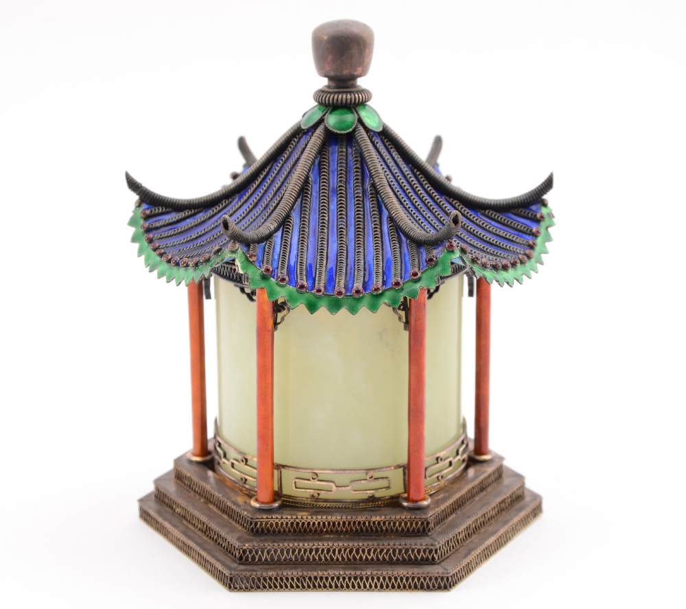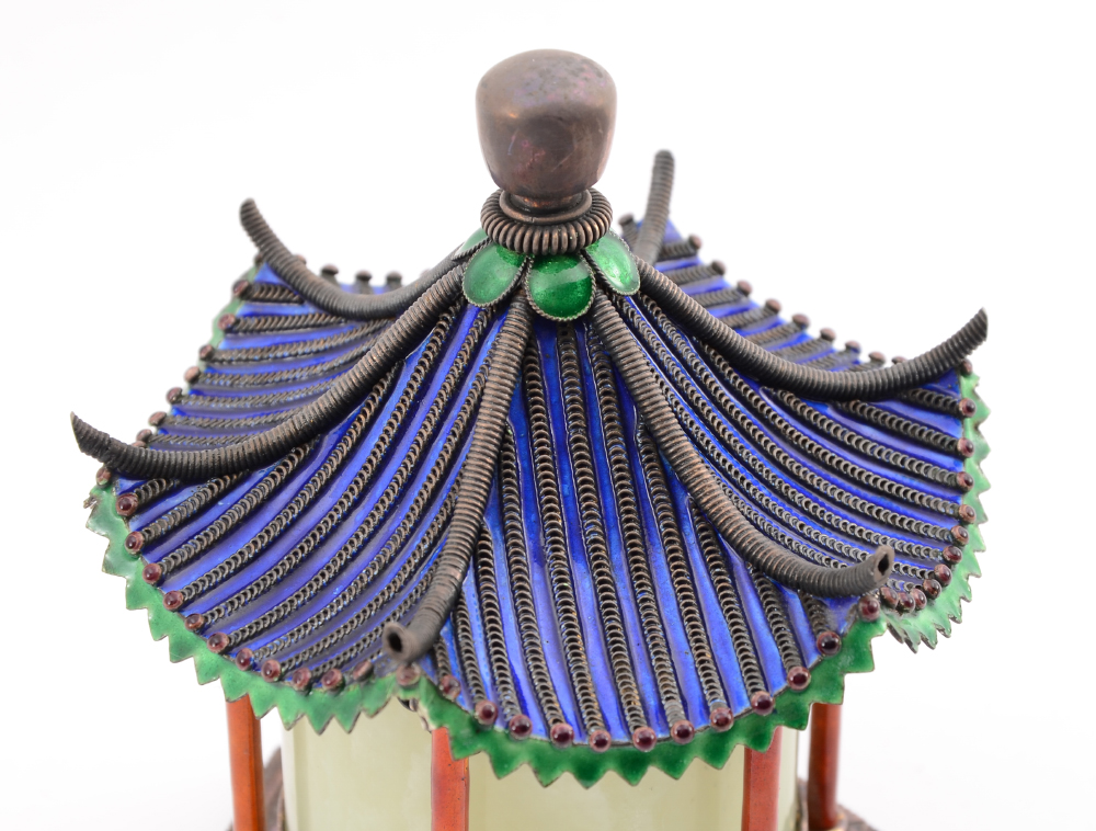 CHINESE SILVER ENAMEL PAGODA TEA CADDY: Pagoda shaped lid with blue and green enamel, body with red enamel column supports, green hardstone insert, stepped base, marked Silver. Overall measures 5 3/4'' h. x 5'' dia.
