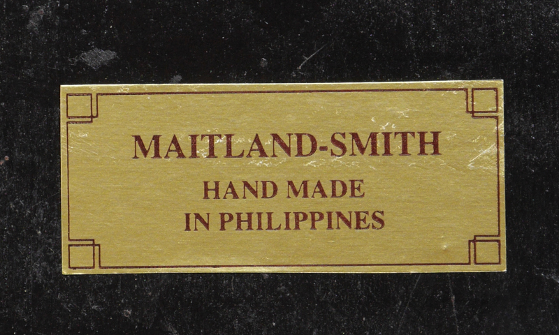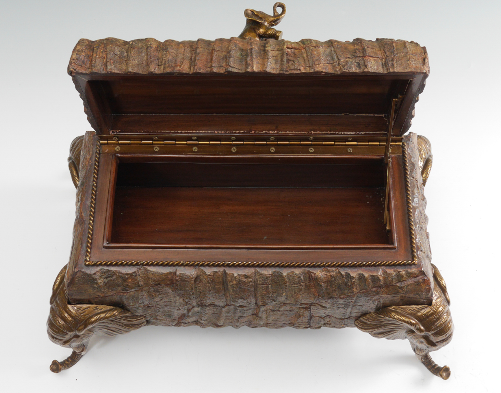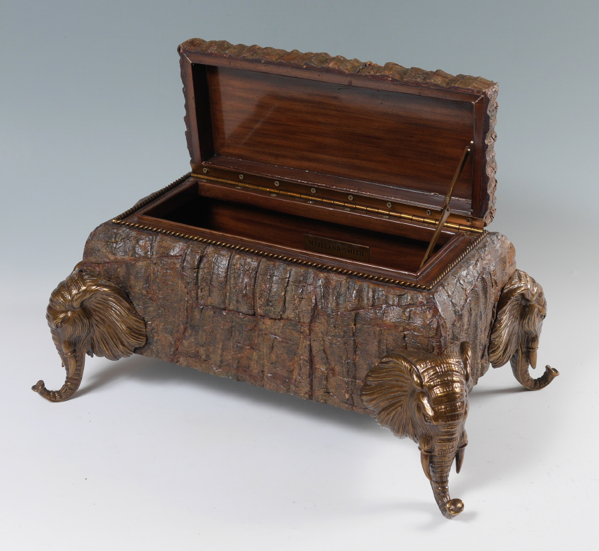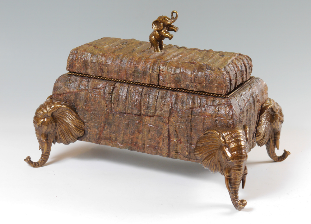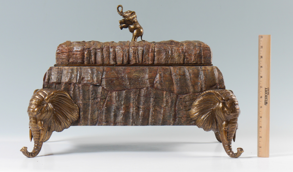 MAITLAND SMITH ELEPHANT BOX: Faux composite elephant skin box, hinged lid with brass standing elephant finial, on 4 elephant head feet. Maitland Smith tag inside, overall measures 15 1/2'' h. x 22 1/2'' x 14''.