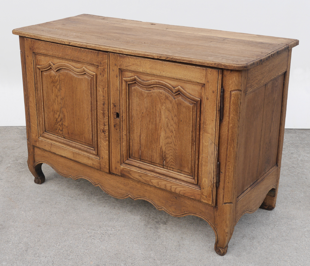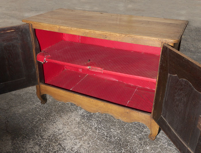 WALNUT COUNTRY FRENCH COMMODE: Early 19th century, 2 blind doors, iron hinges, shaped skirt and front legs, overall measures 34'' h. x 50'' x 22 1/2''.