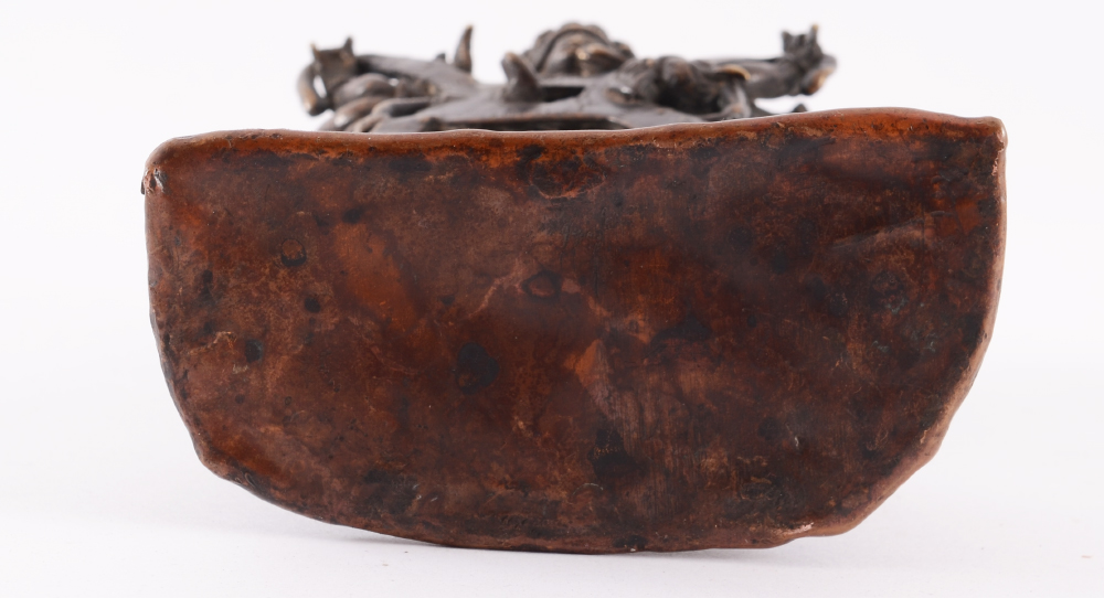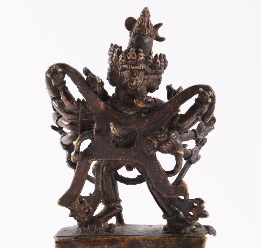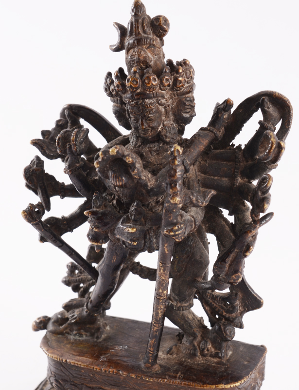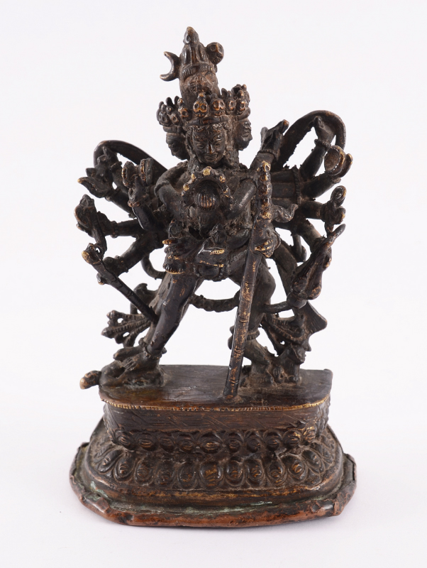 BRONZE NEPALESE FIGURE OF SAMVARA & CONSORT: Nicely detailed figure of the Northern Buddhist deity Samvara with his consort Vajravarahi standing above 2 bodies, on sealed lotus base. No visible markings, 6'' h. x 4'' x 2''.