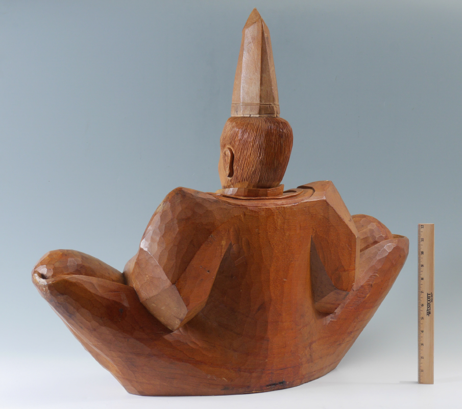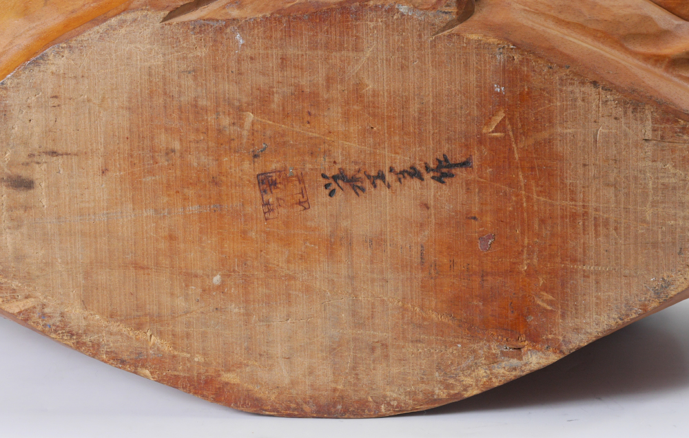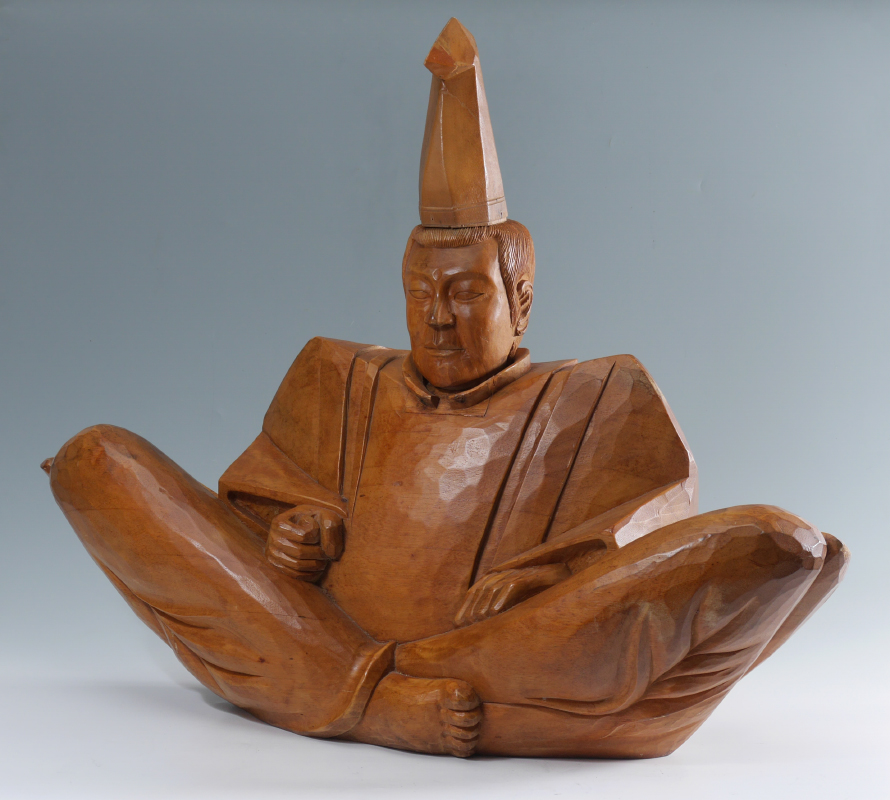 LARGE SIGNED JAPANESE CARVED WOOD SEATED PRIEST: Figure of a Shinto priest seated in lotus position, signed in characters on base. Overall measures 28 1/2'' h. x 35 1/2'' x 10''.