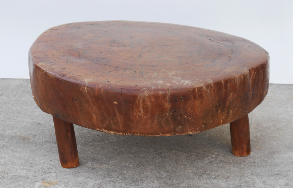 EARLY COUNTRY BUTCHERS LOW TABLE: Single live edge slab top on 3 turned legs. Circa early 19th century, overall measures 16'' h. x 35 1/4'' dia.