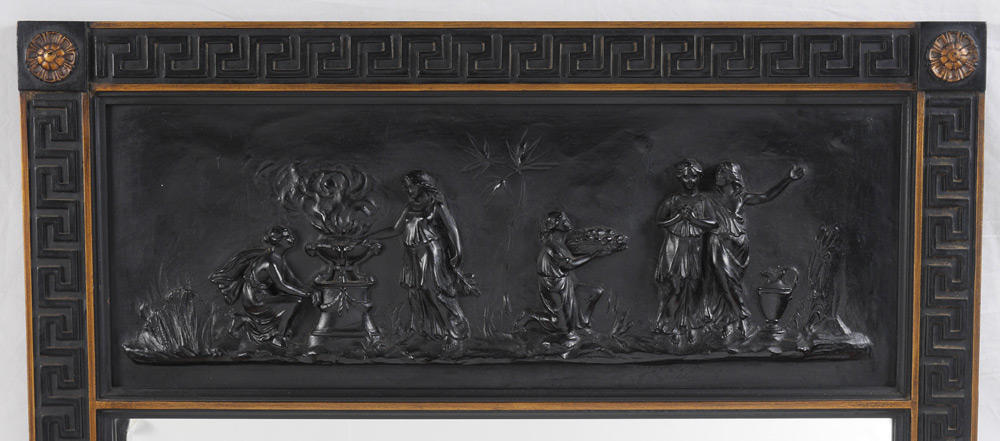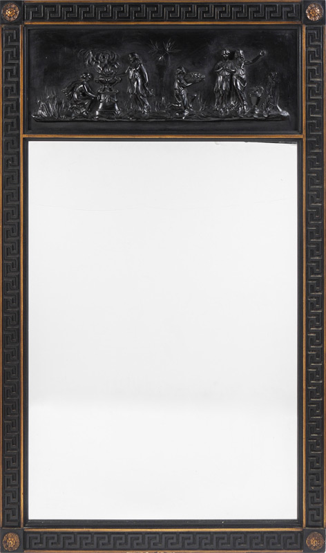 NEOCLASSICAL DECORATIVE WALL MIRROR: Frame with neoclassical carved frieze panel, Greek key motif trim, medallions at corners. FB Decorative Arts, New York, label on back. Overall measures 45 3/4'' x 28 1/4'' x 1''.