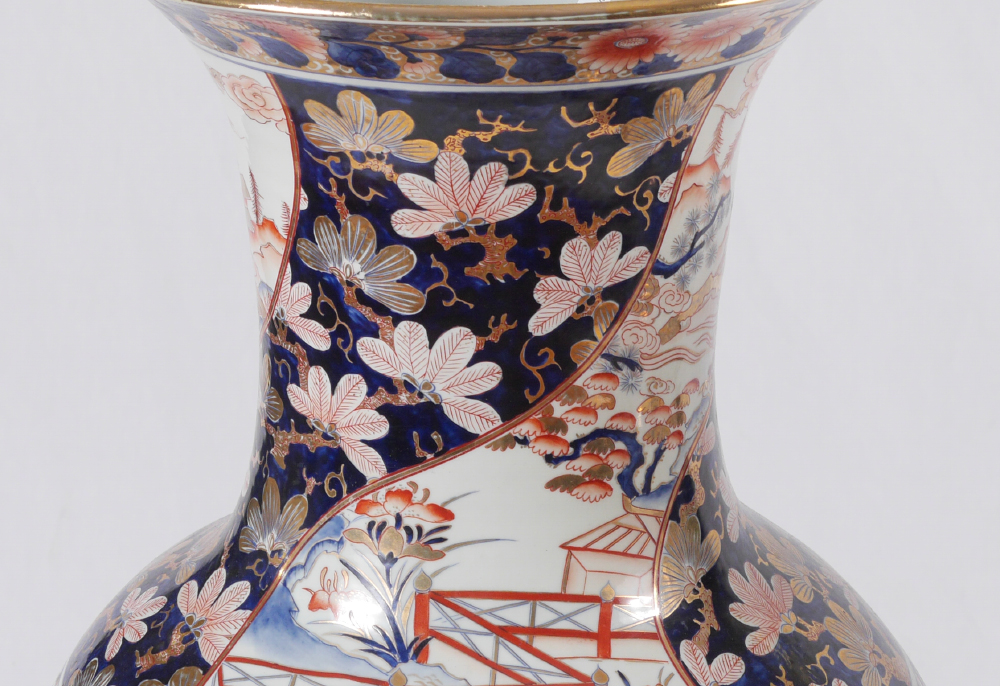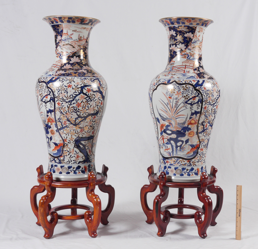 PAIR OF CHINESE PALACE VASES: 20th century, baluster form, polychrome decorated with floral and outdoor genre motifs, overall 36 1/4'' h. x 16''. Sold with wood stands, 15'' h. x 19 1/2''.