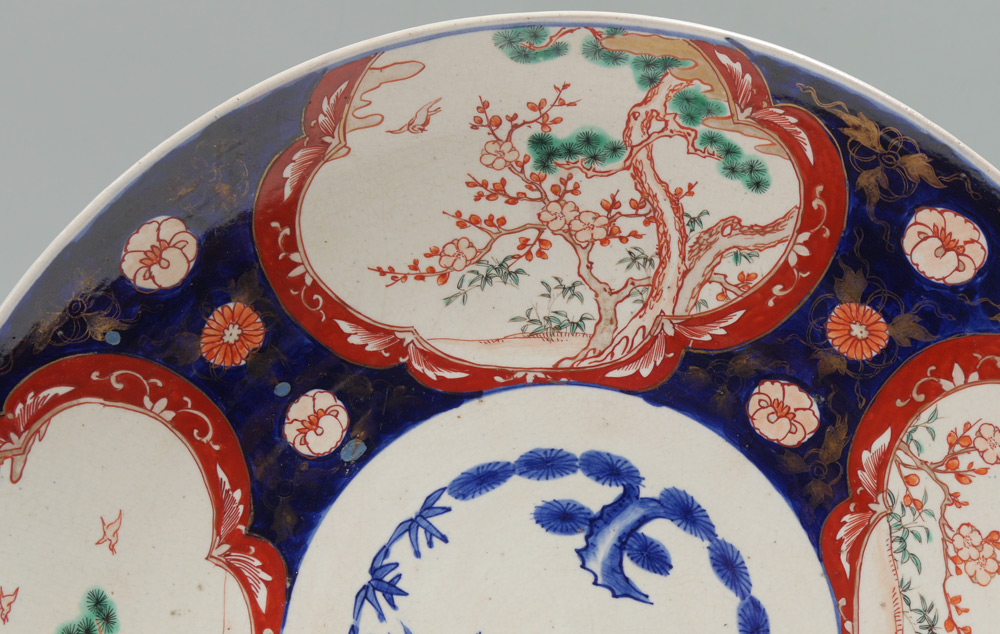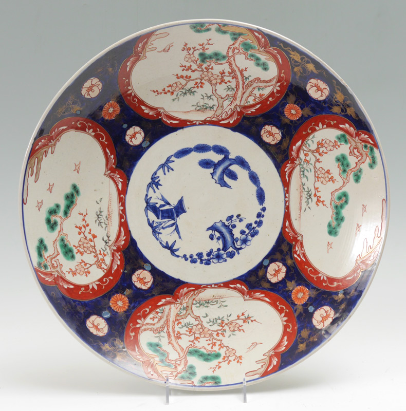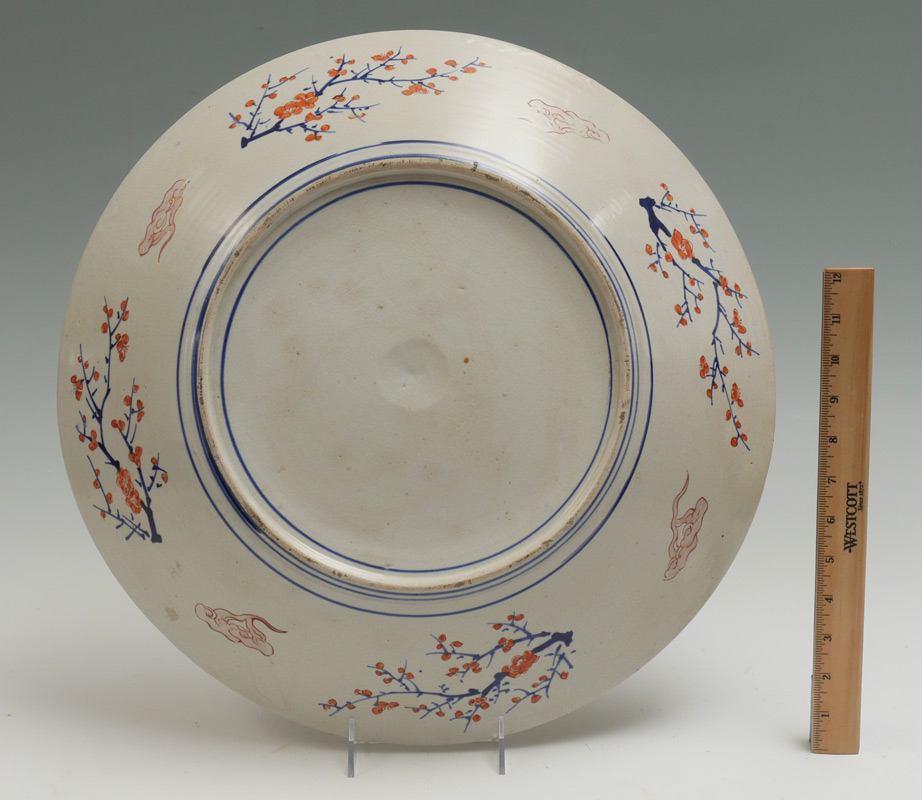 LARGE JAPANESE IMARI CHARGER: Cobalt blue ground, blue floral ring center medallion, landscapes in reserves, no visible mark or signature. 2 1/2'' h. x 18 1/4''.