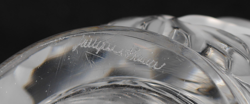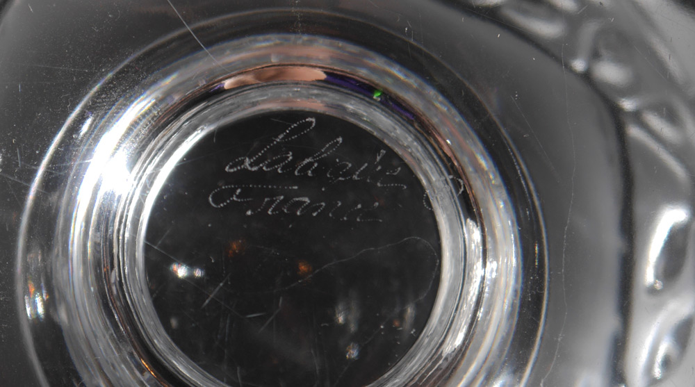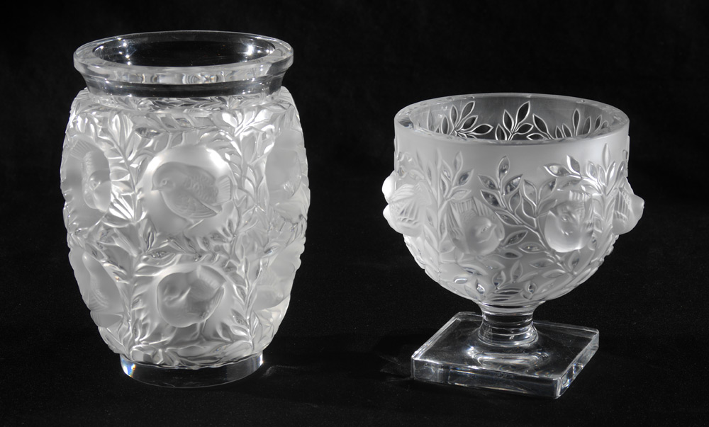 LALIQUE BAGATELLE & ELIZABETH CRYSTAL VASES: 2 pieces total to include 1) ''Bagatelle'' doves vase, etched Lalique mark on base, 6 3/4'' h. x 4 3/4''. 2) ''Elizabeth'' sparrows footed vase, etched Lalique mark, 5 1/4'' h. x 5 1/2''.