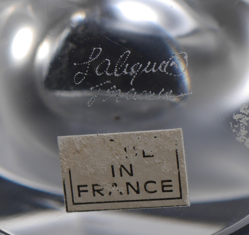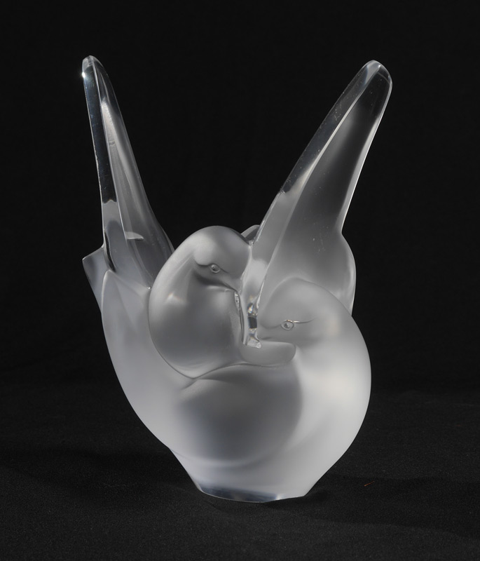 LALIQUE SYLVIE FROSTED CRYSTAL VASE: Stylized doves frosted crystal vase with flower frog, signed on base, original label, 8 1/4'' h. x 6 3/4'' x 4 1/4''.