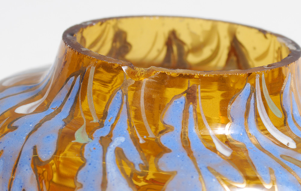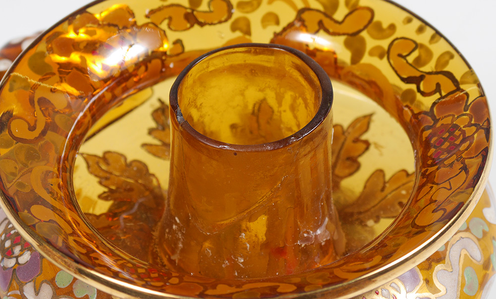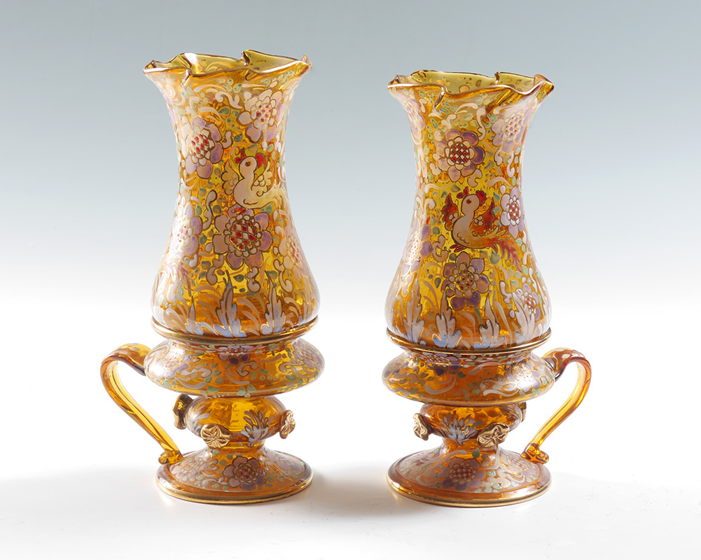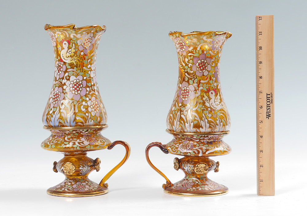 BOHEMIAN ENAMELED AMBER GLASS CANDLE LAMPS: Matched pair with floral and bird motifs. Flared shades with folded rim, bases with single handle. Overall measures 11 1/4'' h. x 6''.