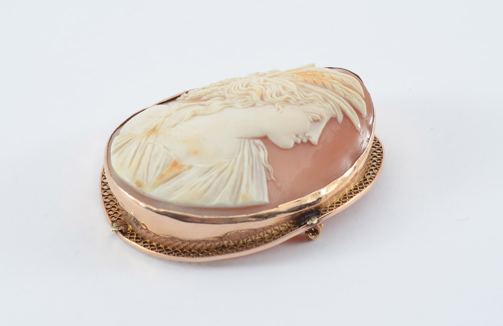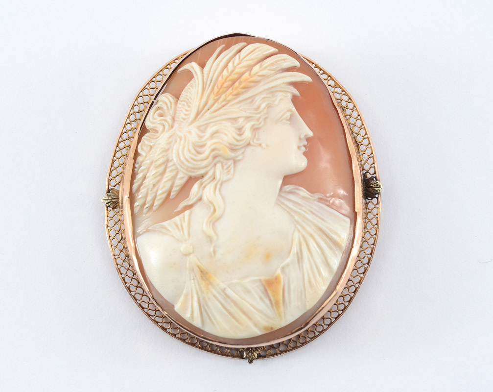 MONUMENTAL 18K CARVED CAMEO BROOCH PENDANT: Depicting Sif, golden haired goddess of grain. Shell carved cameo in 18k gold frame. Measures 2.5 x 2.25.