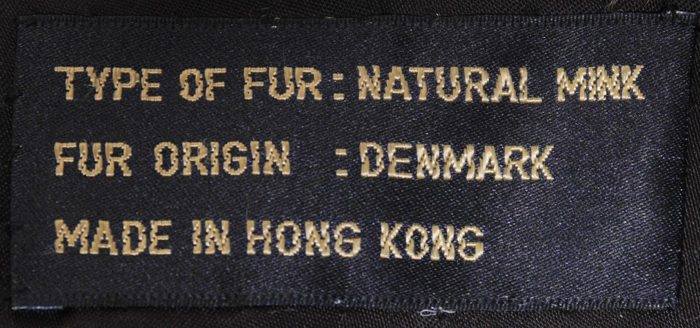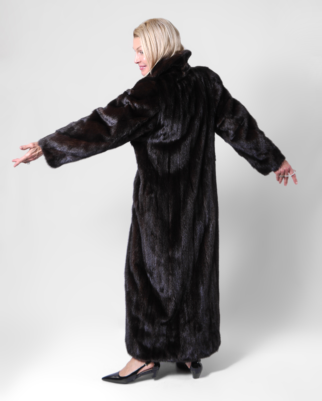 FULL LENGTH BLACK RANCH MINK: Origin of fur is Denmark. Full length maxi length with fold up collar. Size 12 label. Measures approx. 53'' collar to hem, 19'' shoulder to shoulder and 21'' shoulder to cuff.