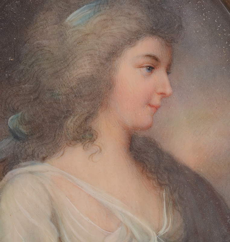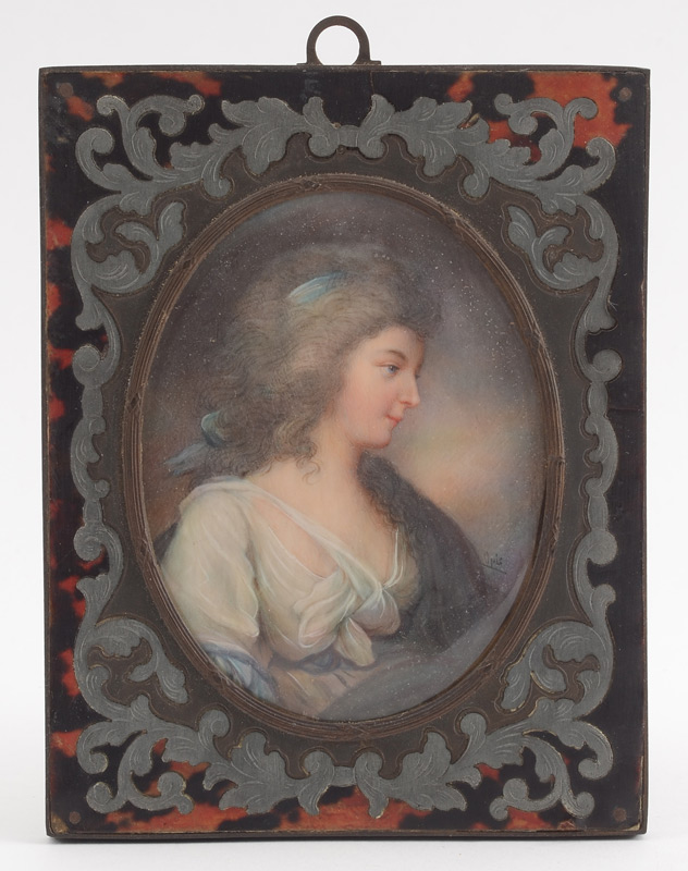 FINE ILLEGIBLY SIGNED MINIATURE PORTRAIT PAINTING: Oval measurements 3.25'' x 2.5'', mixed media, frame 4.75'' x 3.75''.