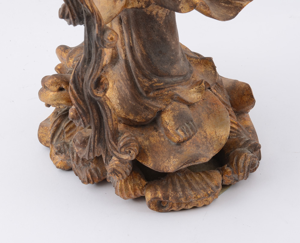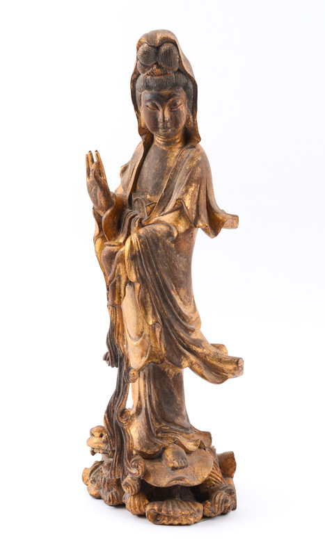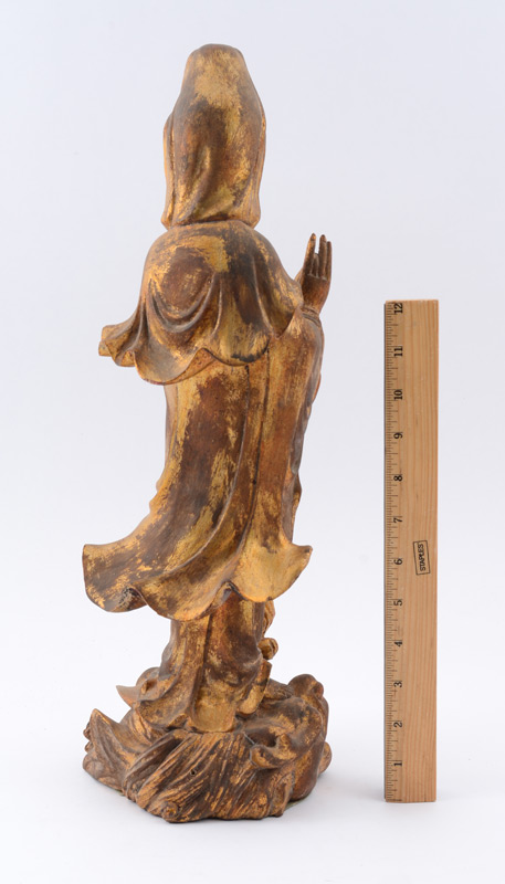 CHINESE CARVED GILT WOOD QUAN YIN FIGURE: Figure of Quan Yin with right hand raised, left hand pouring bottle, standing on dragon. Overall measures 17 3/4'' h. x 6 1/2''.
