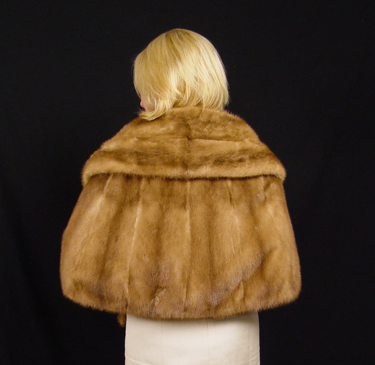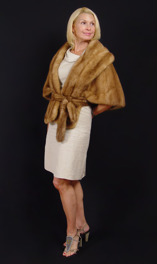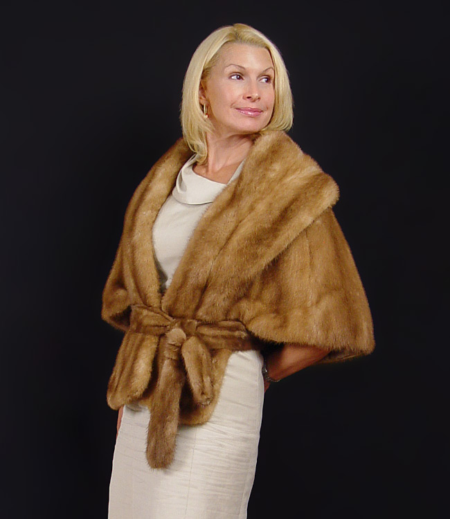 MINK WRAP WITH FULL LAPEL AND BELT: Rich collar lapel continues into slit pockets. 24'' long in the front.