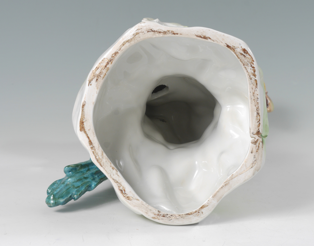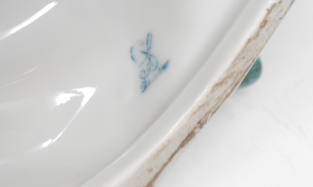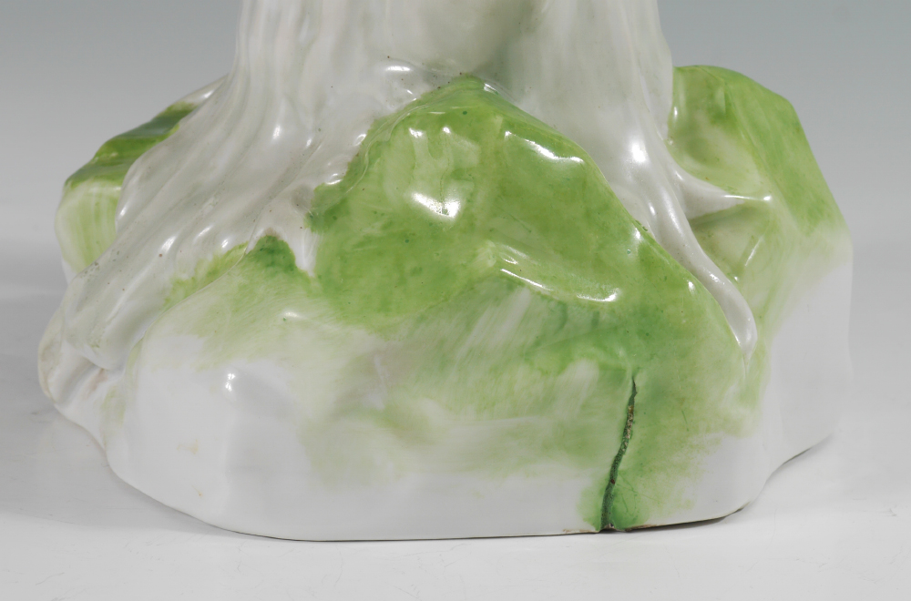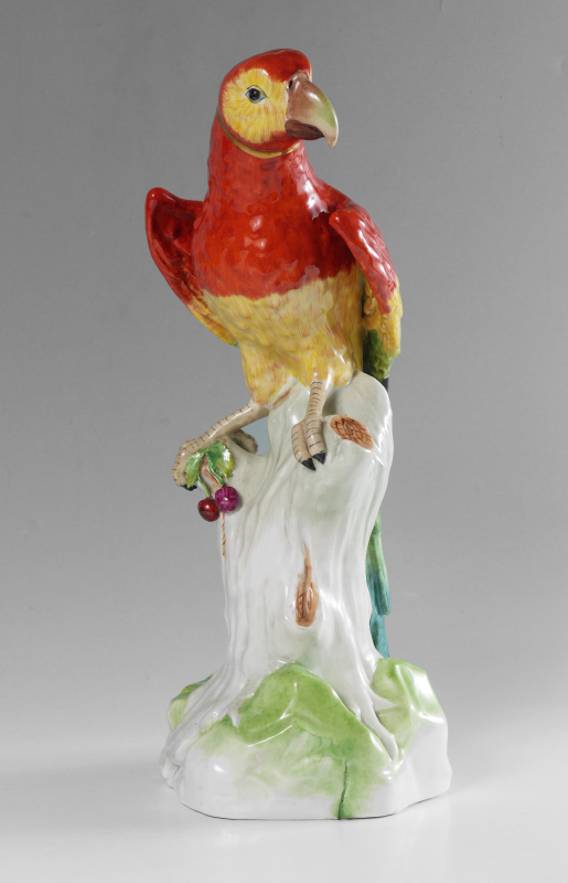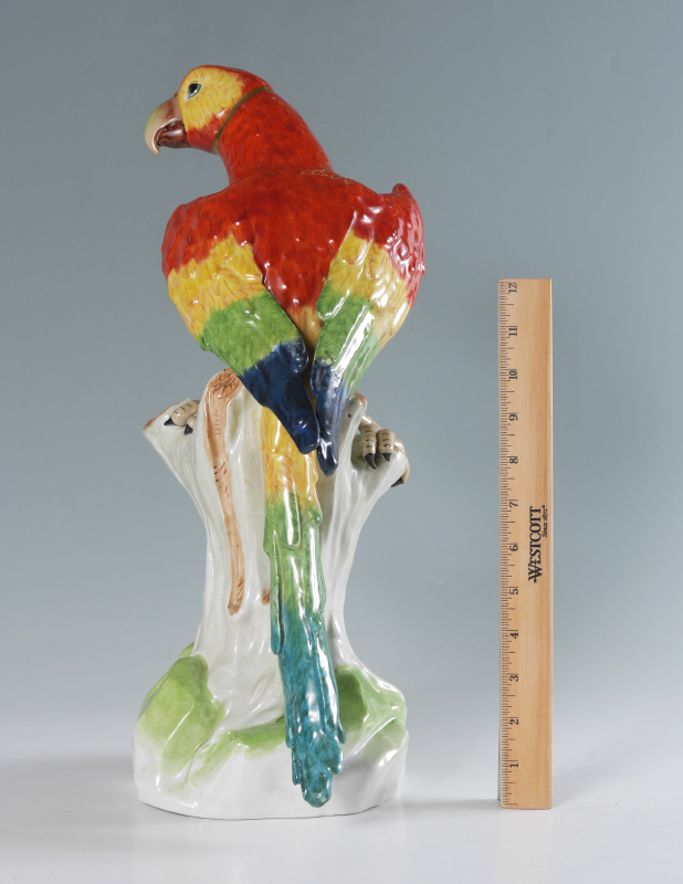 DRESDEN RED PORCELAIN MACAW / PARROT FIGURINE: Figure of a macaw or parrot on a stump with fruit at feet, blue Dresden mark. Overall measures 17 1/2'' h. x 6 3/4''.