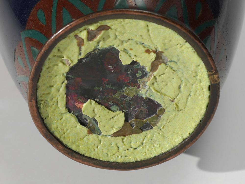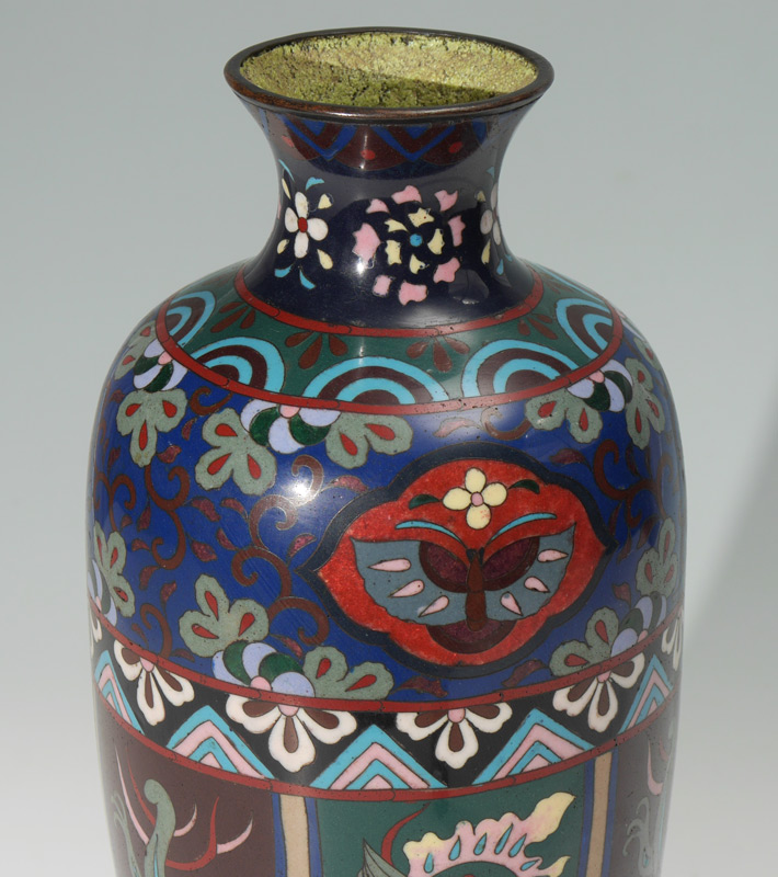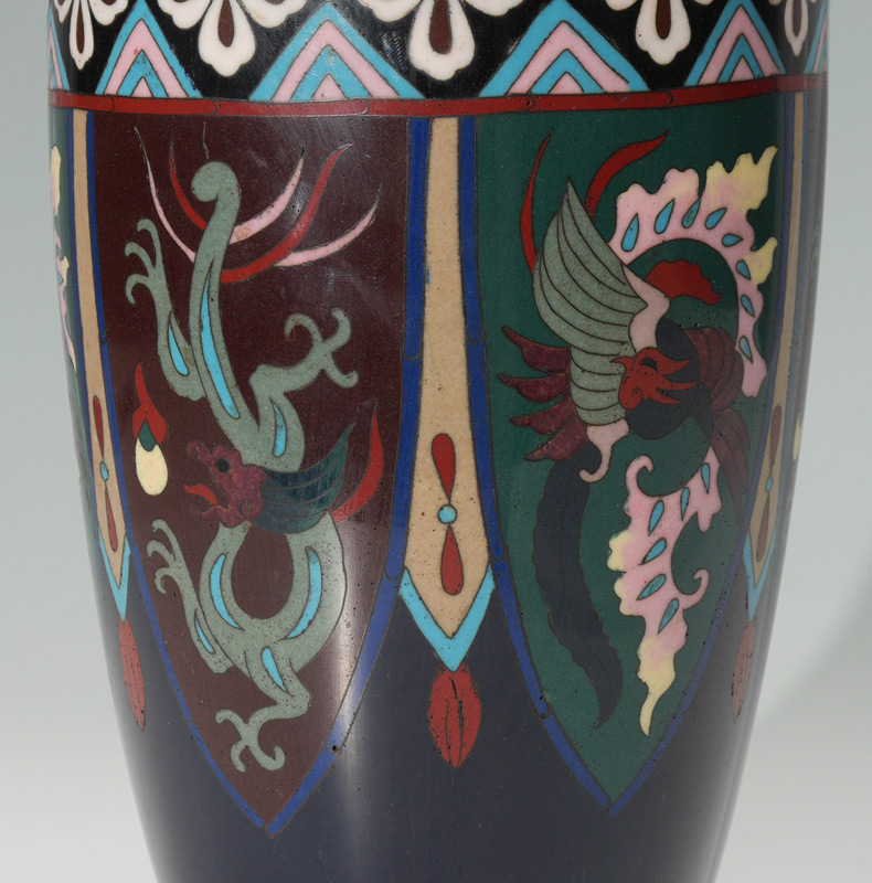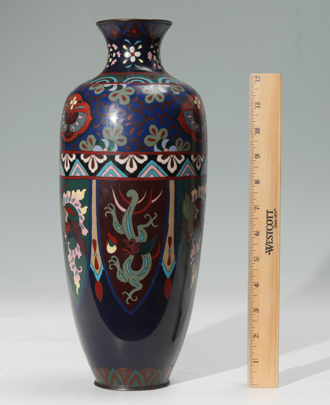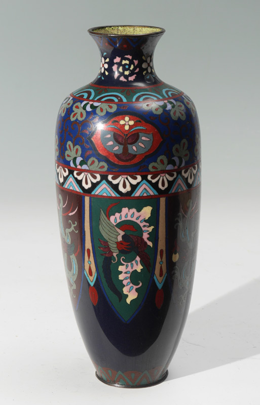 LARGE CHINESE CLOISONNE VASE: Deep blue ground, floral and moth motif bands at top and shoulder, body with alternating shields of dragons and birds. No visible mark or signature, 14 1/4'' h. x 5 3/4''.