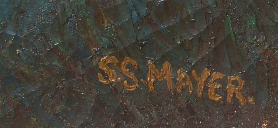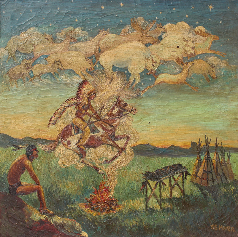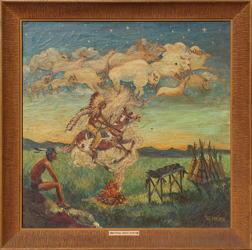 AMERICAN INDIAN MYTHICAL GREAT SPIRIT PAINTING: Oil/Canvas, 28'' x 28'', signed lower right S.S. Mayer, original frame, 33'' x 33''.