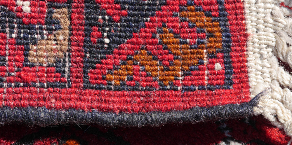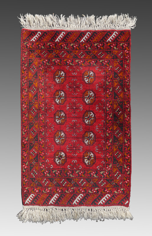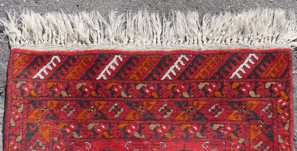 APPROX. 20-40 YR. OLD PAKISTANI BOKHARA HAND KNOTTED WOOL RUG, 2'8'' x 4'1'': This Bokhara has the traditional format and colors with its red rust field and alternating rows of round and cross shaped ''guls''. Condition is good.
