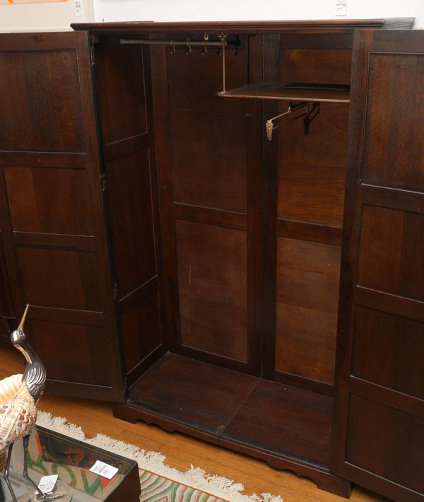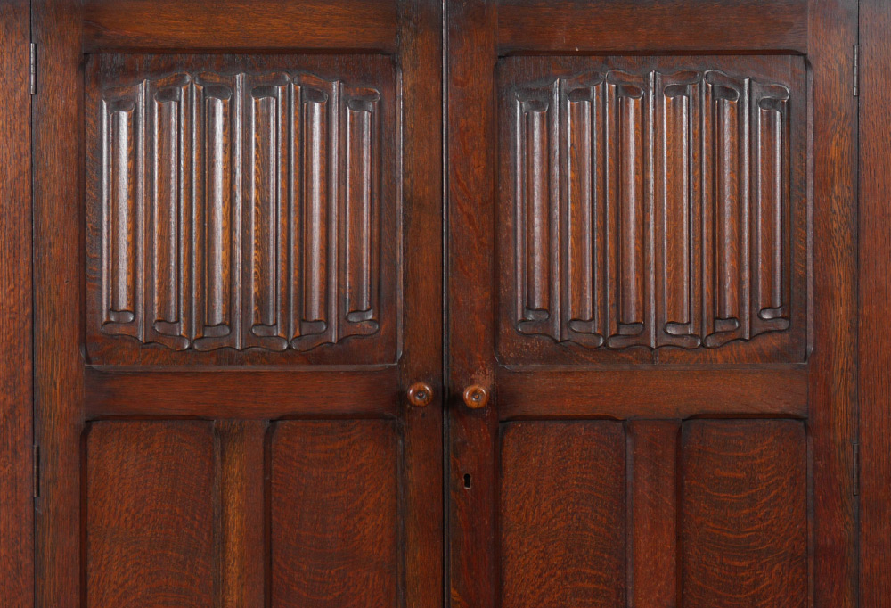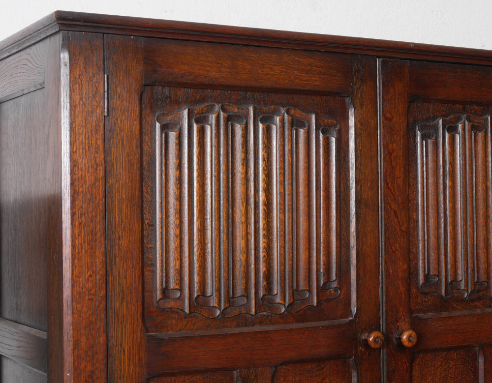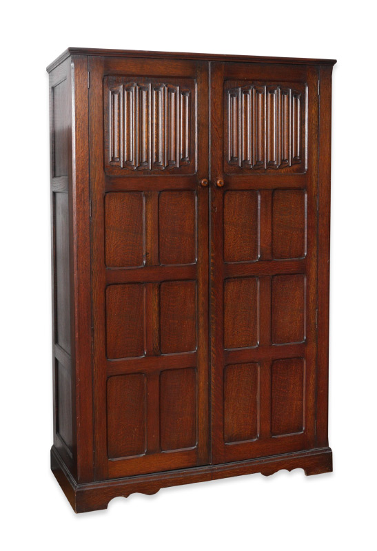 CARVED OAK LINEN FOLD ARMOIRE: 2 paneled doors, top panel on each with carved linen fold decoration, opens to hanging shelf, bar and hooks. Measures 73 1/4'' h. x 47 3/4'' x 19 1/4''.
