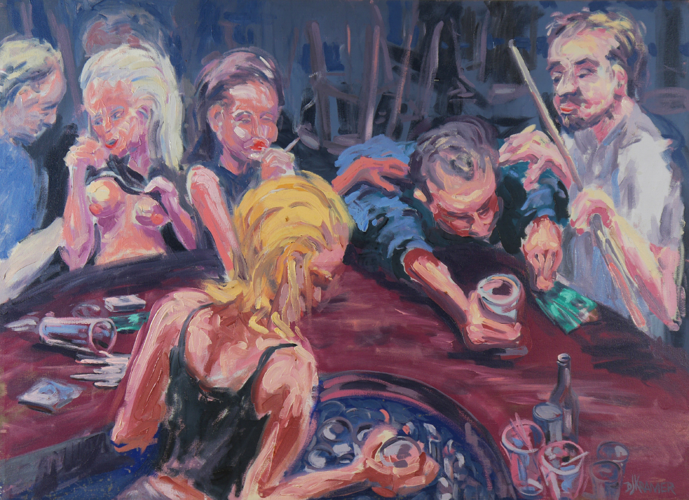 KRAMER, Dave, (American 20th C): Bar Scene, Oil/Canvas, 42'' x 58'', signed lower right, unframed.