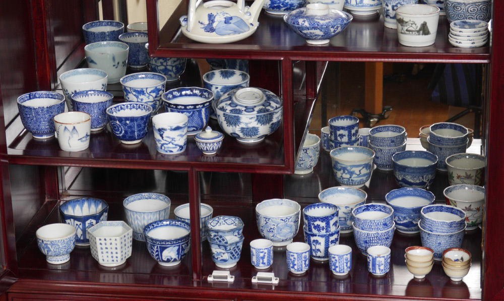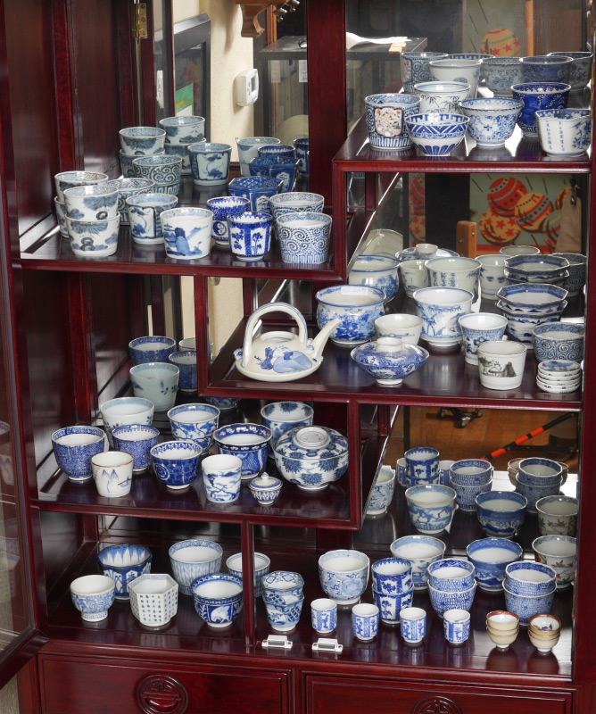 73 PIECE COLLECTION OF JAPANESE BLUE & WHITE DECORATED CUPS: An assembled collection of approx. 73 cups, saucers and one teapot (4 3/4'' h. x 6 1/2'').