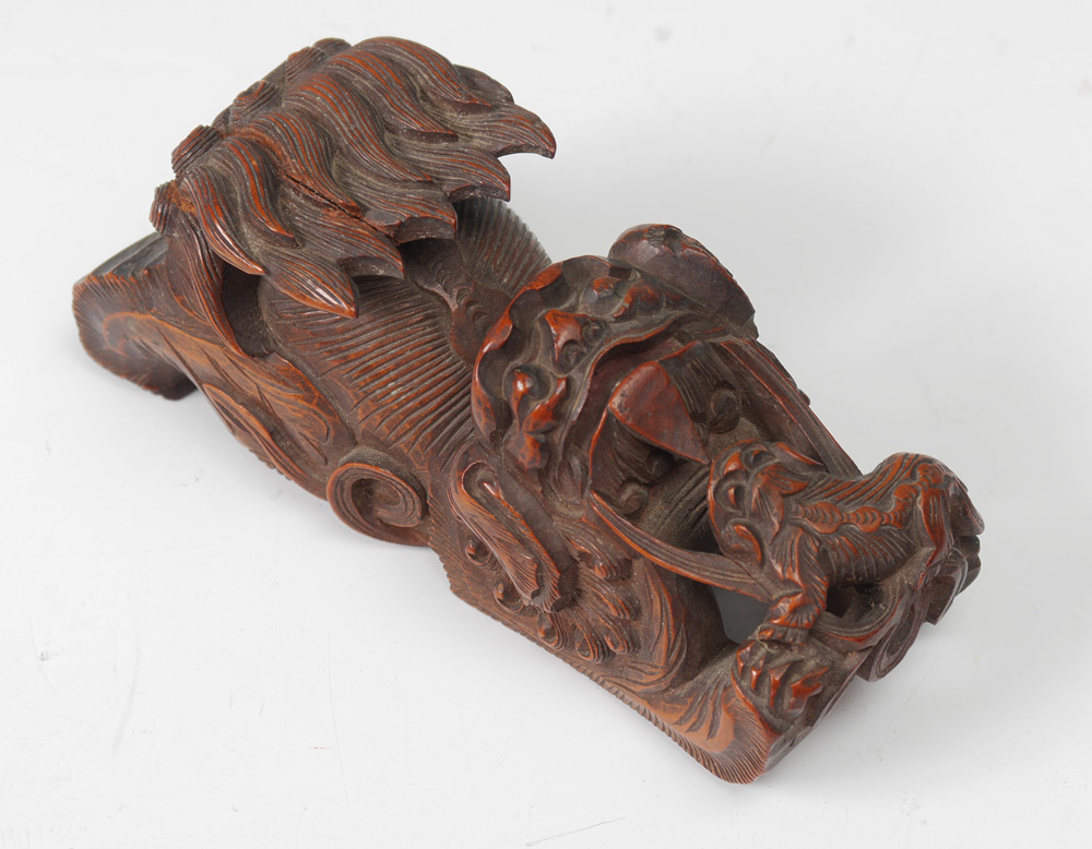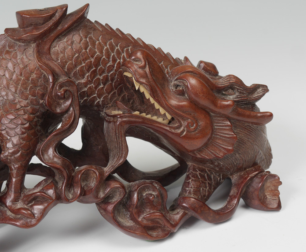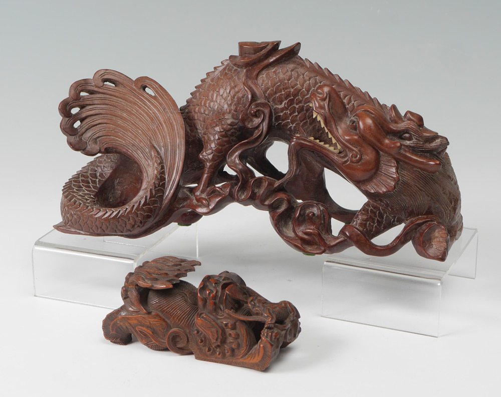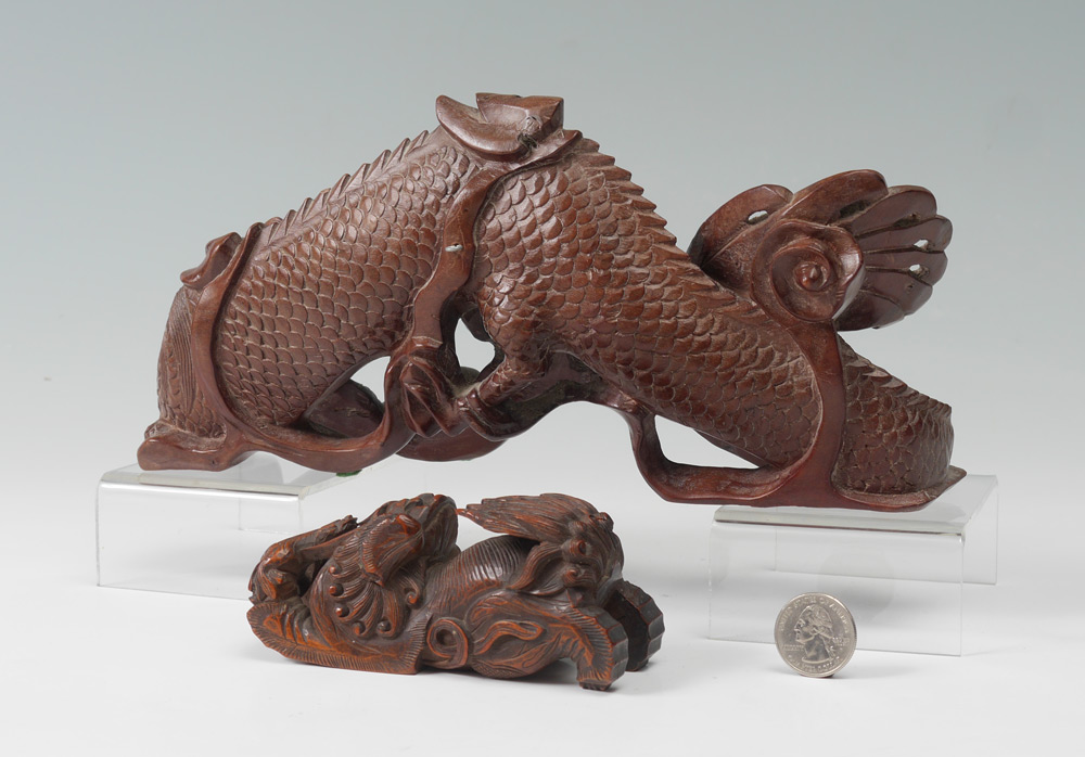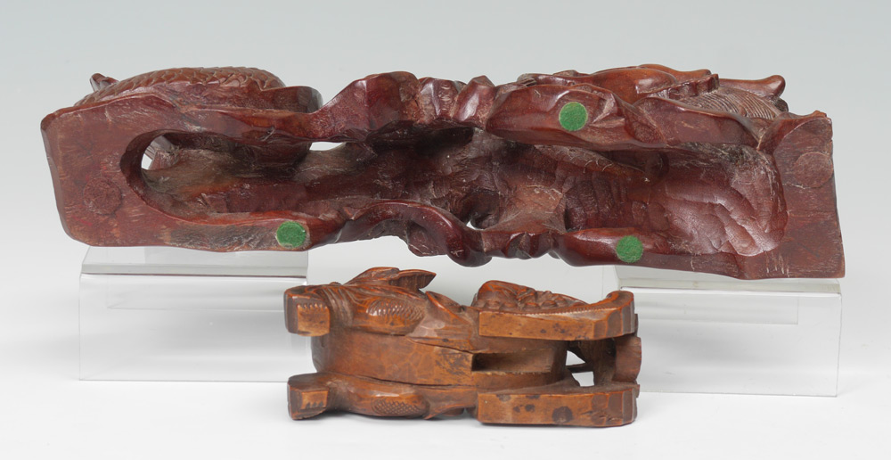 CHINESE CARVED WATER DRAGON & FOO DOG: 2 pieces total to include 1) Figural water dragon or serpent with bone teeth, measures 5'' h. x 10 1/2'' x 3''. 2) Stretching foo dog with pup, 2'' h. x 4 1/2''.