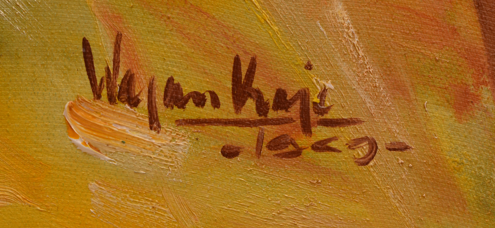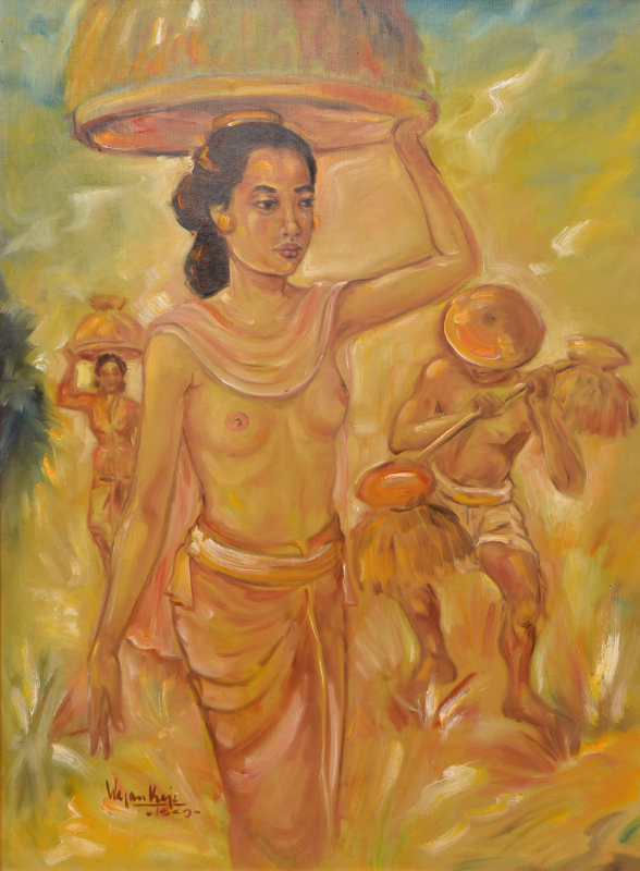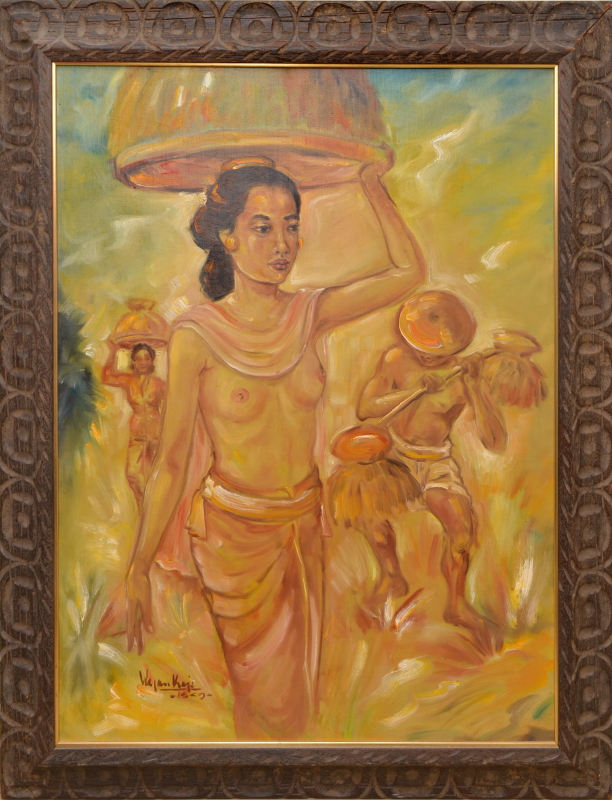 ILLEGIBLY SIGNED BALINESE PAINTING SEMI NUDE WORKERS IN THE FIELD: Oil/Canvas Board, 32'' x 25'', signed lower left and dated '67, carved frame, 39.5'' x 31''.