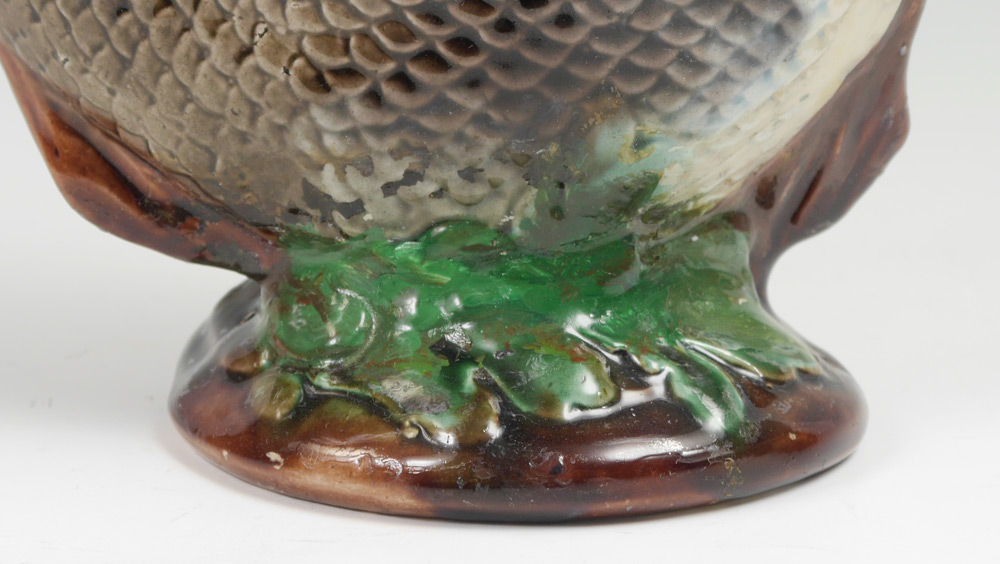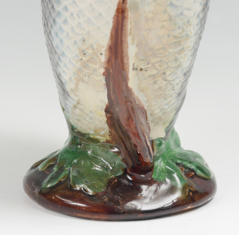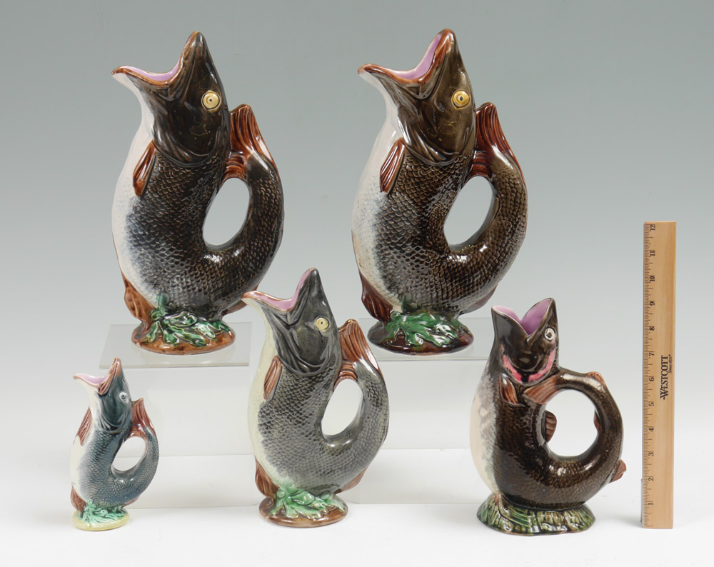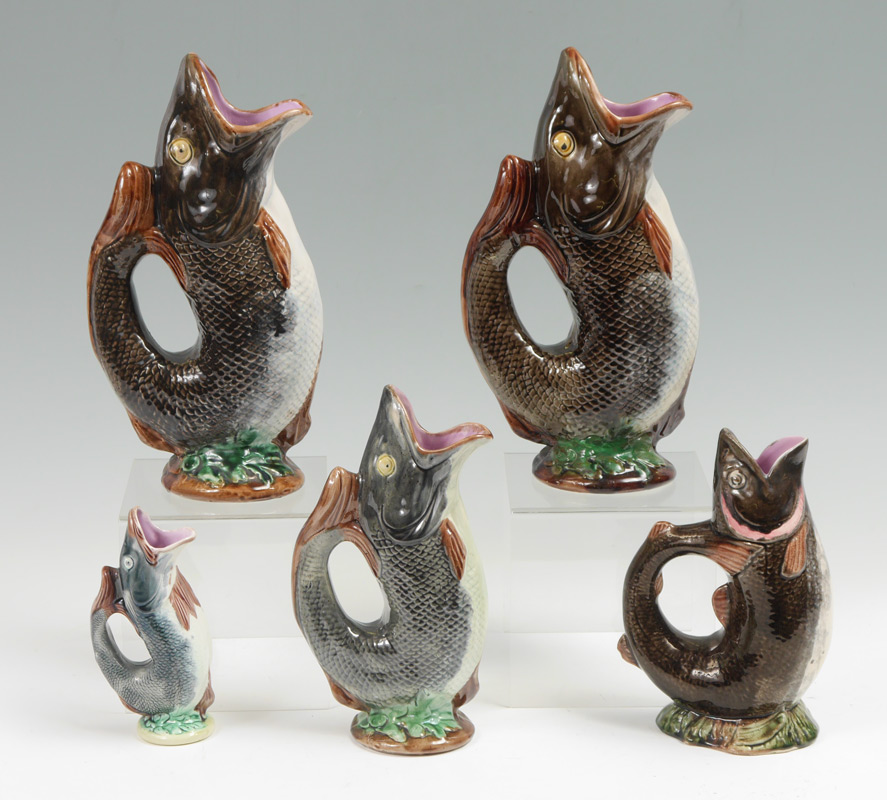 5 MAJOLICA FISH FORM PITCHERS: An assembled collection of 5 total, the largest measuring 13'' h. x 7'' x 4 1/4'', the smallest 7'' h.