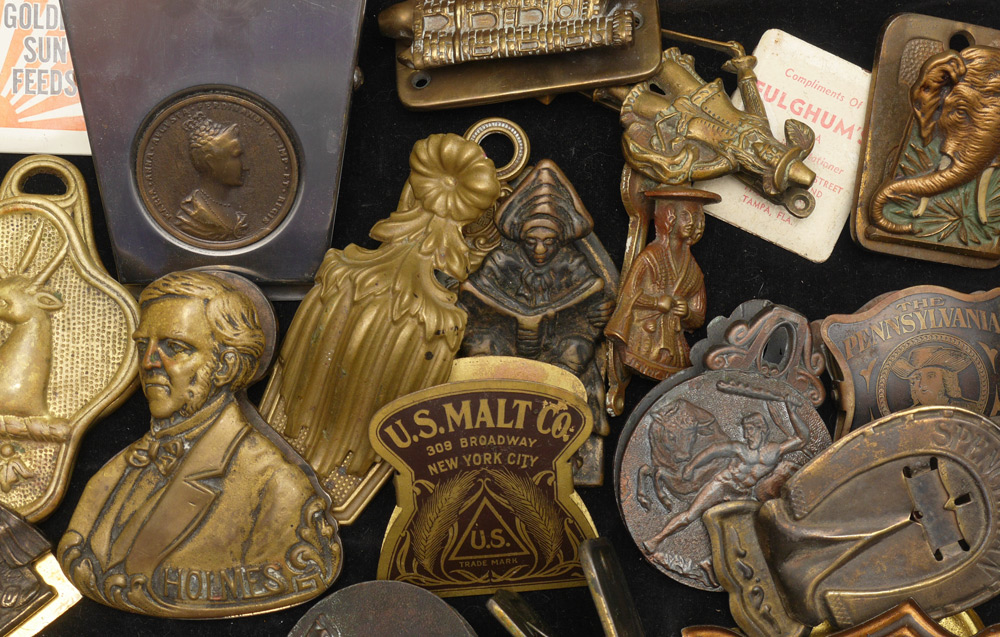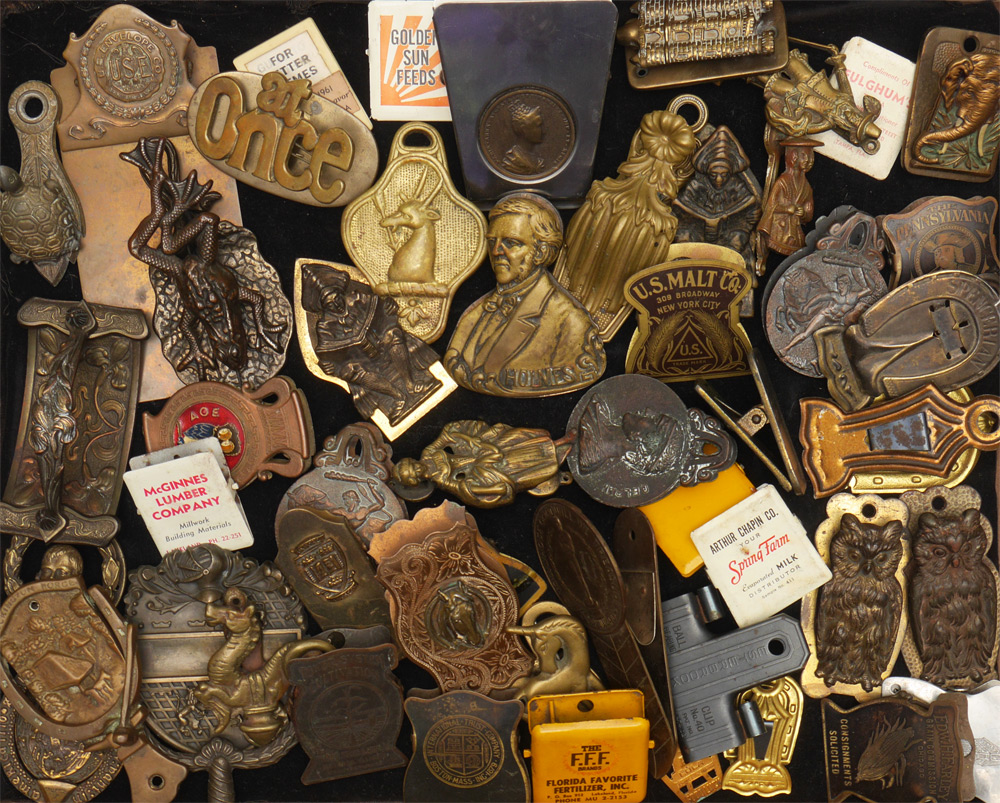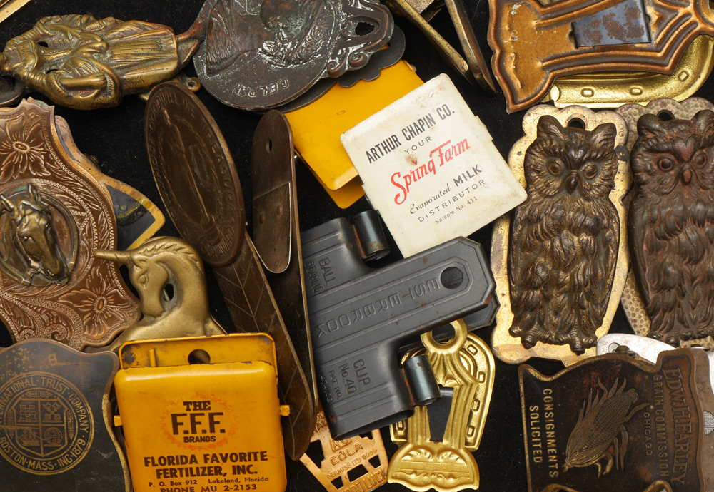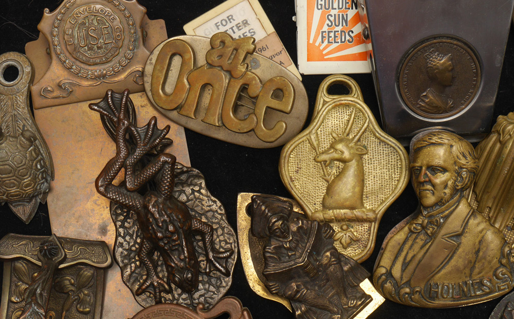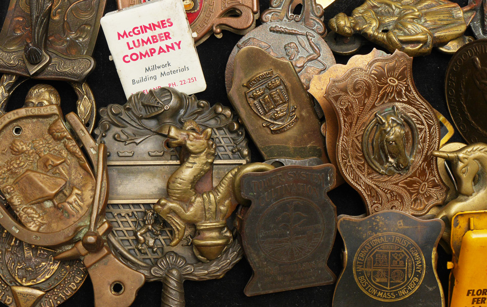 ESTATE COLLECTION OF VINTAGE CLIPS AND DOOR KNOCKERS: Bronze, steel, tin, iron, metal figural clips and knockers to include owl, frog, horse, bullfight, turtle, advertising, and more. Approx. 45 clips, 5 knockers and an ink blotter.