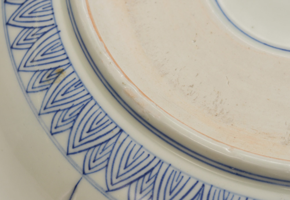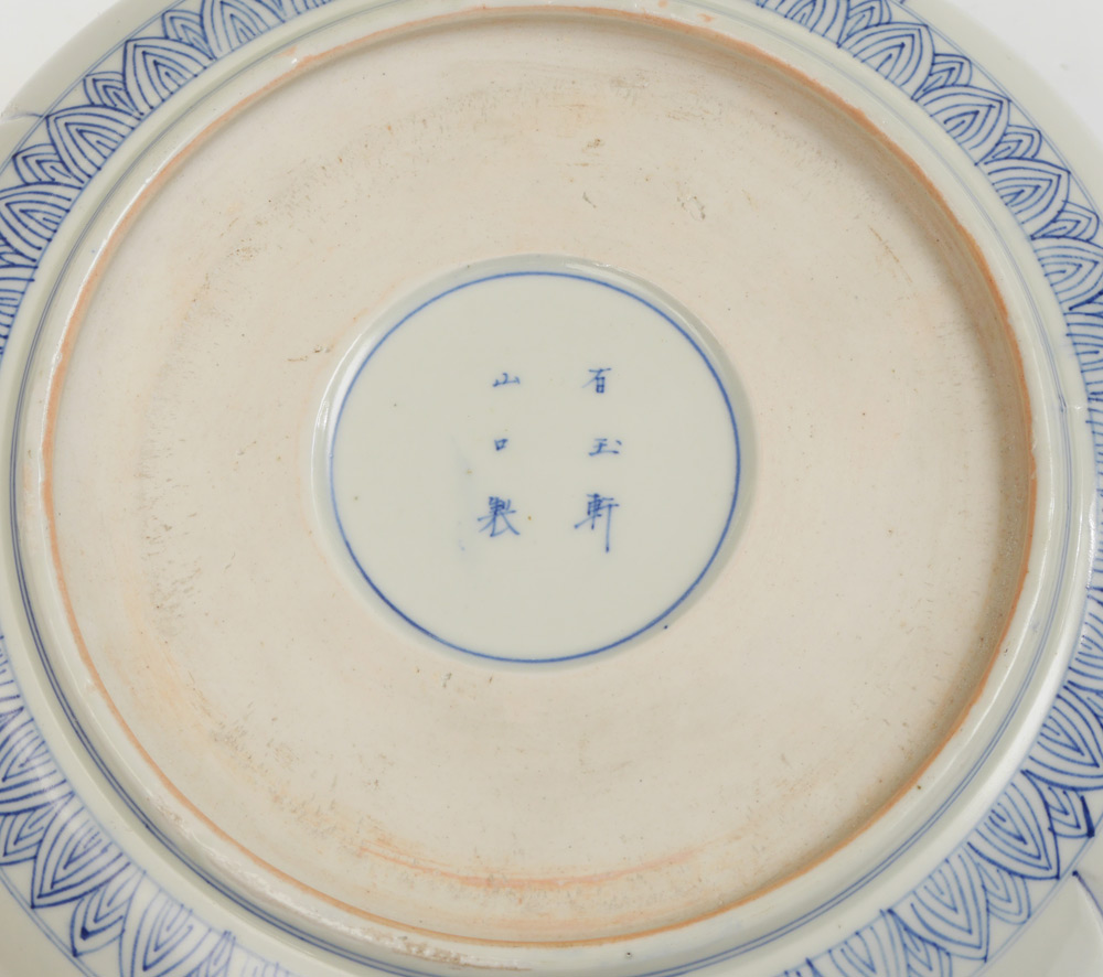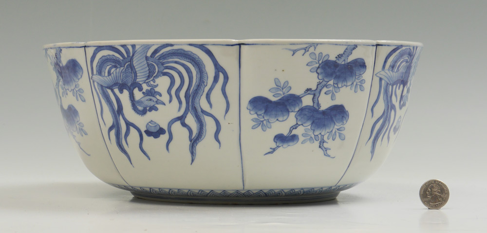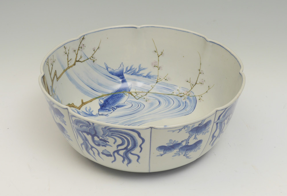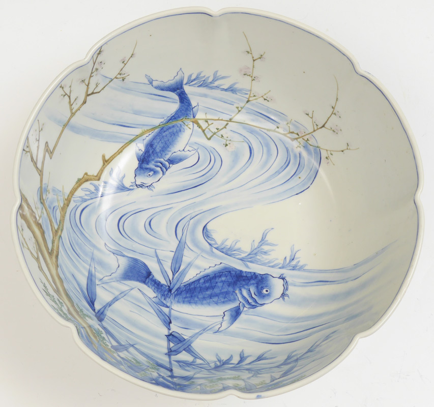 LARGE JAPANESE BLUE & WHITE DECORATED KOI BOWL: Scalloped rim, interior with blue & white decorated Koi fish and stream, polychrome cherry tree with blossom. Exterior blue & white genre panels. 5 1/4'' h. x 13 1/4''.
