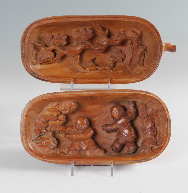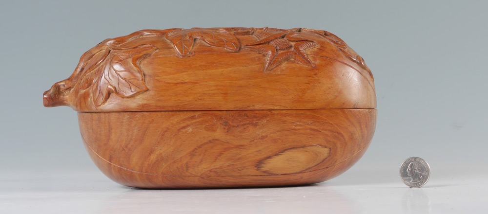 CHINESE CARVED WOOD GOURD COVERED BOX: Unique covered box in the form of a gourd, exterior carved with foliate motifs, interior lid with tree, base with outdoor genre scene of children playing. 5 1/2'' h. x 10 3/4'' x 4 1/2''.