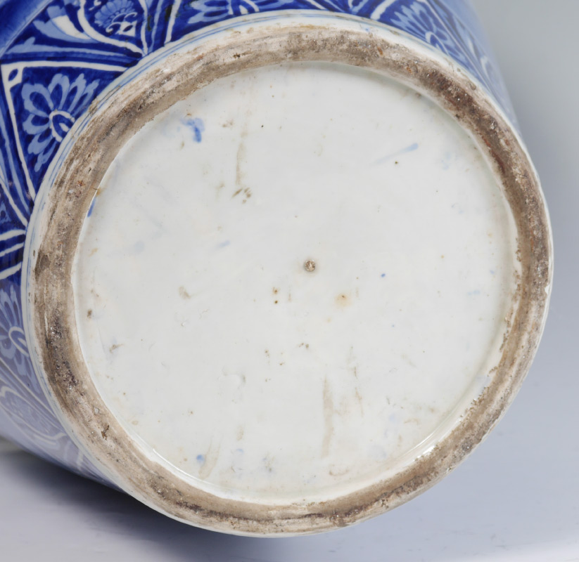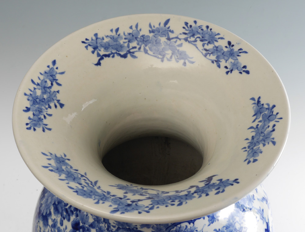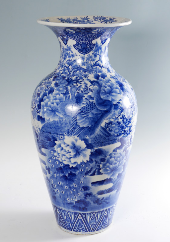 LARGE ORIENTAL BLUE & WHITE DECORATED FLOOR VASE: Pond landscape design with birds, no visible mark. Overall measures 30 3/4'' h. x 14'' dia.