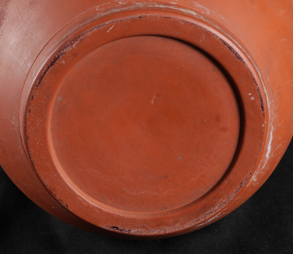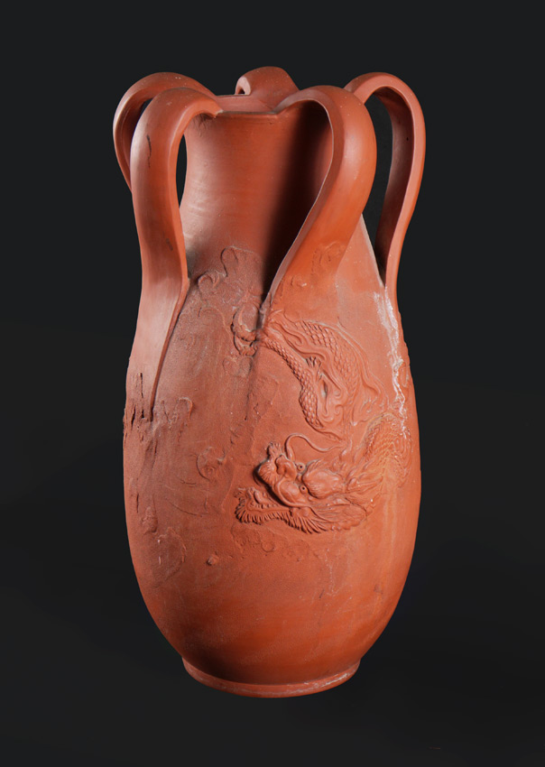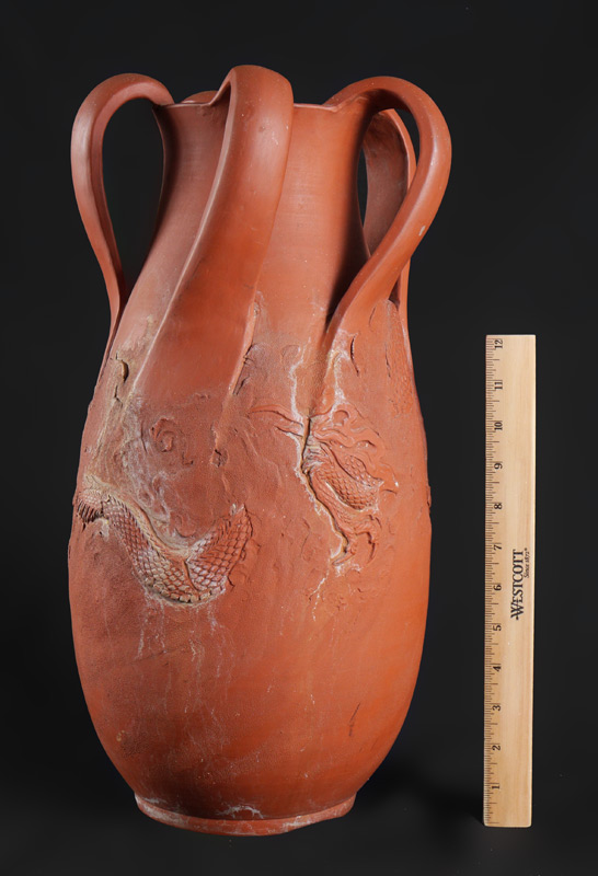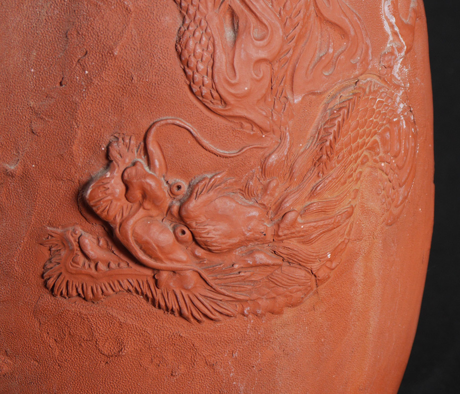 CHINESE TERRACOTTA DRAGON VASE: Unglazed vase with impressed figural dragons on body, sweeping 5 handles, unmarked as to maker. Overall measures 18 1/2'' h. x 9''.