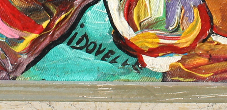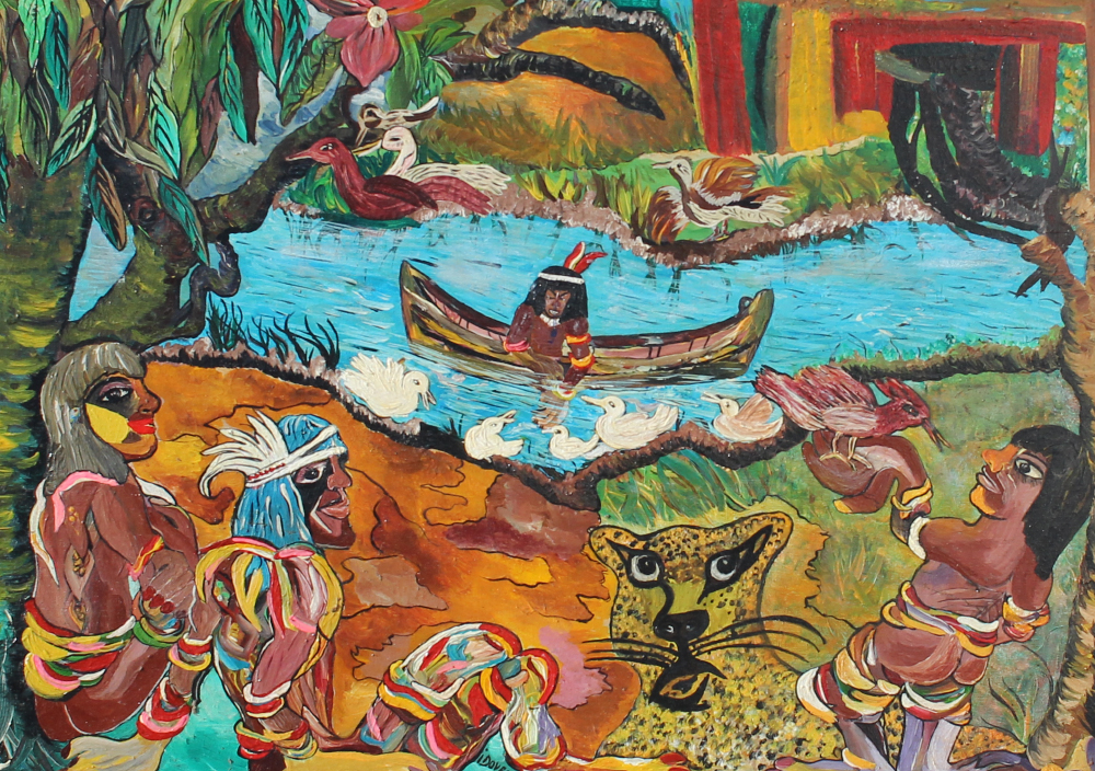 ILLEGIBLY SIGNED BRAZILIAN (?) INDIAN FOLK ART PAINTING: Scene Depicts A River with Indian in a Canoe Fishing and Onlookers, Oil/Canvas, 20'' x 28'', signed in lower margin Idovelle(?), framed 27'' x 34.5''.